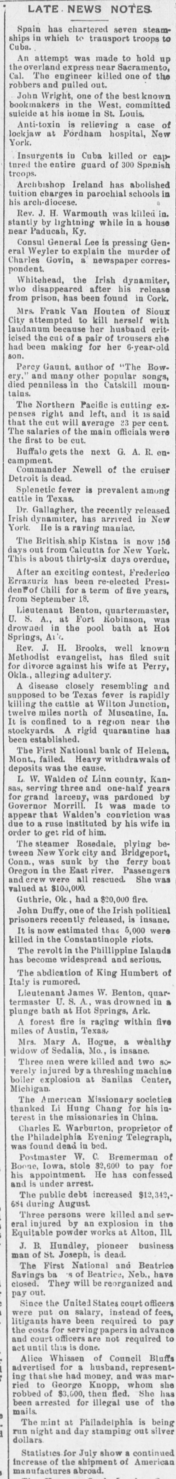LATE NEWS NOTES. Spain has chartered seven steamships in which to transport troops to Cuba. dn ploy 07 open SUM attentity uv the overland express near Sacramento, Cal. The engineer killed one of the 'fno Pelind pue robbers John Wright, one of the best known bookmakers in the West. committed suicide at his home in St. Louis. Anti-toxin is relieving a case of lockjaw at Fordham hospital, New York. Insurgents in Cuba killed or captured the entire guard of 300 Spanish treops. Archbishop Ireland has abolished tuition charges in parochial schools in his arch-diocese. Rev. J. H. Warmouth was killed in. stantly by lightning while in a house near Paducah, Ky. Consul General Lee is pressing General Weyler to explain the murder of Charles Govin, a newspaper correspondent. Whitehead, the Irish dynamiter, who disappeared after his release Code u! punoj been has шолу Mrs. Frank Van Houten of Sioux City attempted to kill herself with laudanum because her husband criticised the cut of a pair of trousers she had been making for her 6-year-old 'uos Percy Gaunt. author of "The Bow. ery." and many other popular songs, died penniless in the Catskill mountains. The Northern Pacific is cutting expenses right and left, and it IS said that the cut will average 33 per cent. The salaries of the main officials were out eq 01 18.1g the Buffalo gets the next G. A. R. encampment. Commander Newell of the cruiser Detroit is dead. Splenetic fever is prevalent among cattle in Texas. Dr. Gallagher, the recently released Irish dynamiter, has arrived in New York. He is a raving maniac. The British ship Kistna is now 156 days out from Calcutta for New York. This is about thirty-six days overdue, After an exciting contest, Frederico Errazuriz has been re-elected PresiAears' eve JO when B JOJ ОЧНИЙ destrol "8T September mo.r Lieutenant Benton, quartermaster, SEM Fort 78 ''V 'S in 7°H to bath [ood the u! ренмолр 3.1V 's.Suj.idg Rev. J. H. Brooks, well known Methodist evangelist, has filed suit for divorce against his wife at Perry, Okla., alleging adultery. A disease closely resembling and repidity s! Texas eq 01 pesoddus killing the cattle at Wilton Junction, twelve miles north of Muscatine, Ia. the near E 01 congued s! 11 stockyards. A rigid quarantine has been established. The First National bank of Helena, Mont., failed. Heavy withdrawals of cansed the SEM deposits L. W. Walden of Linn county, Kansas, serving three and one-half years for grand larceny, was pardoned by Governor Morrill. It was made to appear that Walden's conviction was due to a ruse instituted by his wife in him. 10 PIJ 108 of order The steamer Rosedale, plying between New York city and Bridgeport, toot the sq runs SEM Conna Oregon in the East river. Passengers and crew were all rescued. She was '000'COTS 18 Anlued Guthrie, Ok., had a $20,000 fire. John Duffy, one of the Irish political prisoners recently released, is insane. Were 000'g 2847 estimated Mou S! 41 killed in the Constantinople riots. The revolt in the Phillippine Islands has become widespread and serious. The abdication of King Humbert of Italy is rumored. Lieutenant James W. Benton, quare u! peMMoΓp SEM "V S n plunge bath at Hot Springs, Ark. OAU within required ? ere Forest V miles of Austin, Texas. Mrs. Mary A. Hogue, a wealthy widow of Sedalia, Mo., is insane. Three men were killed and two SOP verely injured by a threshing machine boiler explosion at Sanilas Center, Michigan. The American Missionary societies thanked Li Hung Chang for his interest in the missionaries in China. Charles E. Warburton, proprietor of the Philadelphia Evening Telegraph, peq u! deep punoj SEM JO 0 'M Pottinater Boone, Iowa, stole $2,600 to pay for his appointment. He has confessed arreet repun !! pus The public debt increased $12,342,Supanp 189 Three persons were killed and several injured by an explosion in the Equitable powder works at Alton, III. J. B. Hundley, pioneer business prep SI Josebb, 7S JO man The First National and Beatrice base "9en Beatrice, 10 S. 89 SEATUS pue be IIIAM They closed. no Aug Since the United States court officers were put on salary, instead of fees, litigants have been required to pay the costs for serving papers in advance and court officers are not required to si sup little act Alice Whissen of Council Bluffs advertised for a husband, represent-леш SUM pue Money had she that Sup ried to George Knopp, whom she robbed of $3,600, then fled. She has been arrested for illegal use of the mails The mint at Philadelphia is being silver and statements Sup pur 74.810 una dollars. Statistics for July show a continued increase of the shipment of American manufactures abroad.