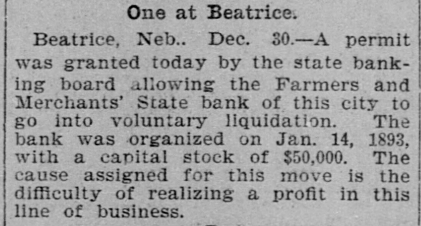 One at Beatrice. Beatrice, Neb.. Dec. 30.-A permit was granted today by the state banking board allowing the Farmers and Merchants' State bank of this city to go into voluntary liquidation. The bank was organized on Jan. 14, 1893, with a capital stock of $50,000. The cause assigned for this move is the difficulty of realizing a profit in this line of business.