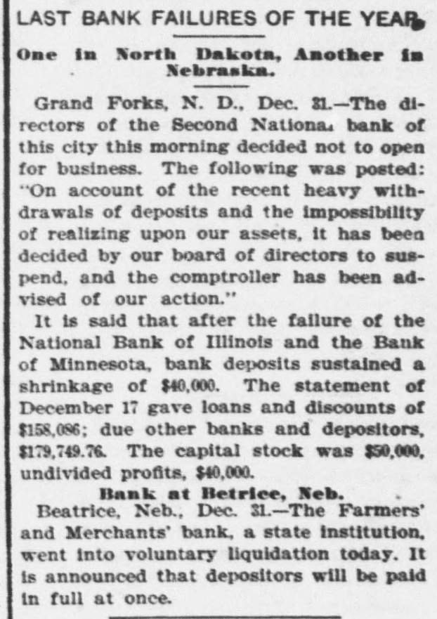 LAST BANK FAILURES OF THE YEAR One in North Dakota, Another in Nebraska. Grand Forks, N. D., Dec. 31.-The directors of the Second National bank of this city this morning decided not to open for business. The following was posted: "On account of the recent heavy withdrawals of deposits and the impossibility of realizing upon our assets, it has been decided by our board of directors to suspend, and the comptroller has been advised of our action." It is said that after the failure of the National Bank of Illinois and the Bank of Minnesota, bank deposits sustained a shrinkage of $40,000. The statement of December 17 gave loans and discounts of $158,086; due other banks and depositors, $179,749.76. The capital stock was $50,000, undivided profits, $40,000. Bank at Betrice, Neb. Beatrice, Neb., Dec. 31.-The Farmers' and Merchants' bank, a state institution, went into voluntary liquidation today. It is announced that depositors will be paid in full at once.