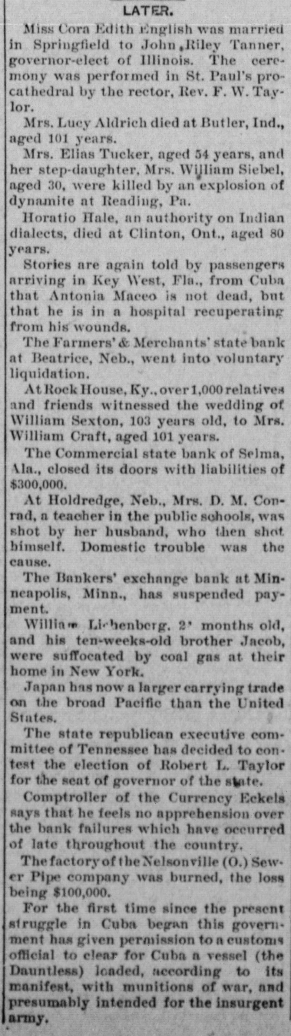 LATER. Miss Cora Edith English was married in Springfield to John Riley Tanner, governor-elect of Illinois. The ceremony was performed in St. Paul's procathedral by the rector, Rev. F. W. Taylor. Mrs. Lucy Aldrich died at Butler, Ind., aged 101 years. Mrs. Elias Tucker, aged 54 years, and her step-daughter, Mrs. William Siebel, aged 30, were killed by an explosion of dynamite at Reading, Pa. Horatio Hale, an authority on Indian dialects, died at Clinton, Ont., aged 80 years. Stories are again told by passengers arriving in Key West, Fla., from Cuba that Antonia Maceo is not dead, but that he is in a hospital recuperating from his wounds. The Farmers' & Merchants' state bank at Beatrice, Neb., went into voluntary liquidation. At Rock House, Ky., over 1,000 relatives and friends witnessed the wedding of William Sexton, 103 years old, to Mrs. William Craft, aged 101 years. The Commercial state bank of Selma, Ala., closed its doors with liabilities of $300,000. At Holdredge, Neb., Mrs. D. M. Conrad, a teacher in the public schools, was shot by her husband, who then shot bimself. Domestic trouble was the cause. The Bankers' exchange bank at Minneapolis, Minn., has suspended payment. William Lichenberg. 2' months old, and his ten-weeks-old brother Jacob, were suffocated by coal gas at their home in New York. Japan has now a larger carrying trade on the broad Pacific than the United States. The state republican executive committee of Tennessee has decided to contest the election of Robert L. Taylor for the seat of governor of the state. Comptroller of the Currency Eckels says that he feels no apprehension over the bank failures which have occurred of late throughout the country. The factory of the Nelsonville (0.) Sew. er Pipe company was burned, the loss being $100,000. For the first time since the present struggle in Cuba began this government has given permission to a customs official to clear for Cuba a vessel (the Dauntless) loaded, according to its manifest, with munitions of war, and presumably intended for the insurgent army.