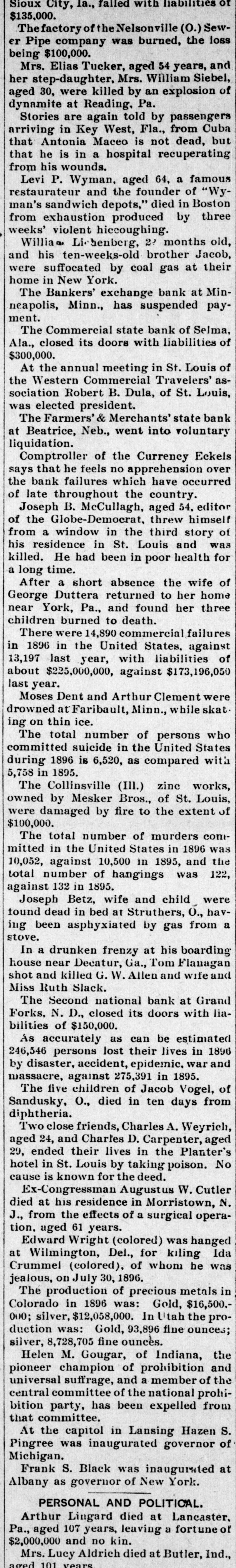 Sioux City, la., failed with liabilities ot $135,000. Thefactory of the Nelsonville (0.) Sewer Pipe company was burned, the loss being $100,000. Mrs. Elias Tucker, aged 54 years, and her step-daughter, Mrs. William Siebel, aged 30, were killed by an explosion of dynamite at Reading, Pa. Stories are again told by passengers arriving in Key West, Fla., from Cuba that Antonia Maceo is not dead, but that he is in a hospital recuperating from his wounds. Levi P. Wyman, aged 64, a famous restaurateur and the founder of "Wyman's sandwich depots," died in Boston from exhaustion produced by three weeks' violent hiccoughing. Willia Lichenberg, 22 months old, and his ten-weeks-old brother Jacob, were suffocated by coal gas at their home in New York. The Bankers' exchange bank at Minneapolis, Minn., has suspended payment. The Commercial state bank of Selma, Ala., closed its doors with liabilities of $300,000. At the annual meeting in St. Louis of the Western Commercial Travelers' association Robert B. Dula, of St. Louis, was elected president. The Farmers' & Merchants' state bank at Beatrice, Neb., went into voluntary liquidation. Comptroller of the Currency Eckels says that he feels no apprehension over the bank failures which have occurred of late throughout the country. Joseph B. McCullagh, aged 54, editor of the Globe-Democrat, threw himself from a window in the third story of his residence in St. Louis and was killed. He had been in poor health for a long time. After a short absence the wife of George Duttera returned to her home near York, Pa., and found her three children burned to death. There were 14,890 commercial failures in 1896 in the United States, against 13,197 last year, with liabilities of about $225,000,000, against $173,196,050 last year. Moses Dent and Arthur Clement were drowned at Faribault, Minn., while skat. ing on thin ice. The total number of persons who committed suicide in the United States during 1896 is 6,520, as compared with 5,758 in 1895. The Collinsville (III.) zinc works, owned by Mesker Bros., of St. Louis, were damaged by fire to the extent of $100,000. The total number of murders committed in the United States in 1896 was 10,052, against 10,500 in 1895, and the total number of hangings was 122, against 132 in 1895. Joseph Betz, wife and child were tound dead in bed at Struthers, O., having been asphyxiated by gas from a stove. In a drunken frenzy at his boarding house near Decatur, Ga., Tom Flanagan shot and killed G. W. Allen and wife and Miss Ruth Slack. The Second national bank at Grand Forks, N. D., closed its doors with liabilities of $150,000. As accurately as can be estimated 246,546 persons lost their lives in 1896 by disaster, accident, epidemic, war and massacre, against 275,391 in 1895. The five children of Jacob Vogel, of Sandusky, O., died in ten days from diphtheria. Two close friends, Charles A. Weyrich, aged 24, and Charles D. Carpenter, aged 29, ended their lives in the Planter's hotel in St. Louis by taking poison. No cause is known for the deed. Ex-Congressman Augustus W. Cutler died at his residence in Morristown, N. J., from the effects of a surgical operation, aged 61 years. Edward Wright (colored) was hanged at Wilmington, Del., for kiling Ida Crummel (colored), of whom he was jealous, on July 30, 1896. The production of precious metals in Colorado in 1896 was: Gold, $16,500.000; silver, $12,058,000. In Utah the production was: Gold, 93,896 fine ounces; silver, 8,728,705 fine ounces. Helen M. Gougar, of Indiana, the pioneer champion of prohibition and universal suffrage, and a member of the central committee of the national prohibition party, has been expelled from that committee. At the capitol in Lansing Hazen S. Pingree was inaugurated governor of Michigan. Frank S. Black was inaugurated at Albany as governor of New York. PERSONAL AND POLITICAL. Arthur Lingard died at Lancaster, Pa., aged 107 years, leaving a fortune of $2,000,000 and no kin. Mrs. Lucy Aldrich died at Butler, Ind., vears 101 aged