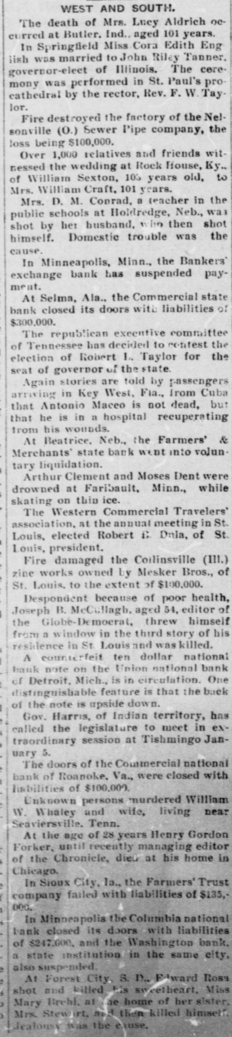 WEST AND SOUTH. The death of Mrs. Lucy Aldrich occurred at Butler. Ind., aged 101 years. In Springfield Miss Cora Edith Eng lish was married to John Riley Tanner, governor-elect of Illinois. The ceremony was performed in St. Paul's procathedral by the rector, Rev. F. W. Taylor. Fire destroyed the factory of the Nelsonville (0.) Sewer Pipe company, the loss being $100,000. Over 1,000 relatives and friends witnessed the wedding at Rock House, Ky., of William Sexton, 103 years old, to Mrs. William Craft, 101 years. Mrs. D. M. Conrad, a teacher in the public schools at Holdredge, Neb., was shot by her husband, he then shot himself. Domestic trouble was the cause. In Minneapolis, Minn., the Bankers' exchange bank has suspended payment. At Selma, Ala., the Commercial state bank closed its doors with liabilities of $300,000. The republican executive committee of Tennessee has decided to contest the election of Robert L. Taylor for the seat of governor of the state. Again stories are told by passengers arriving in Key West, Fta., from Cuba that Antonio Maceo is not dead, but that he is in a hospital recuperating from his wounds. At Beatrice, Neb., the Farmers' & Merchants' state bank went into volun. tary liquidation. Arthur Clement and Moses Dent were drowned at Faribault, Minn., while skating on thin ice. The Western Commercial Travelers' association, at the annual meeting in St. Louis, elected Robert B. Dnla, of St. Louis, president. Fire damaged the Coilinsville (III.) zine works owned by Mesker Bros., of St. Louis. to the extent of $100,000. Despondent because of poor health, Joseph B. McCullagh, aged 54, editor of the Globé-Democrat, threw himself from a window in the third story of his residence in St Louis and was killed. A counterfeit ten dollar national bank note on the Union national bank of Detroit, Mich., is in circulation. One distinguisliable feature is that the back of the note is upside down. Gov. Harris, of Indian territory, has called the legislature to meet in extraordinary session at Tishmingo January 5. The doors of the Commercial national bank of Roanoke, Va., were closed with liabilities of $100,000. Unknown persons murdered William W. Whaley and wife, living near Seaviersville. Tenn. At the age of 28 years Henry Gordon Forker, until recently managing editor of the Chronicle, died at his home in Chicago. in Sioux City, la., the Farmers' Trust company failed with liabilities of $135,000. In Minneapolis the Columbia national bank closed its doors with liabilities of $247,000, and the Washington bank. a state institution in the same city, also suspended. At Forest City, S. D., F ward Ross shot and killed is SW retheart, Miss Mary Brehl, at ae home of her sister, Mrs. Stew irt, nid then killed himself.