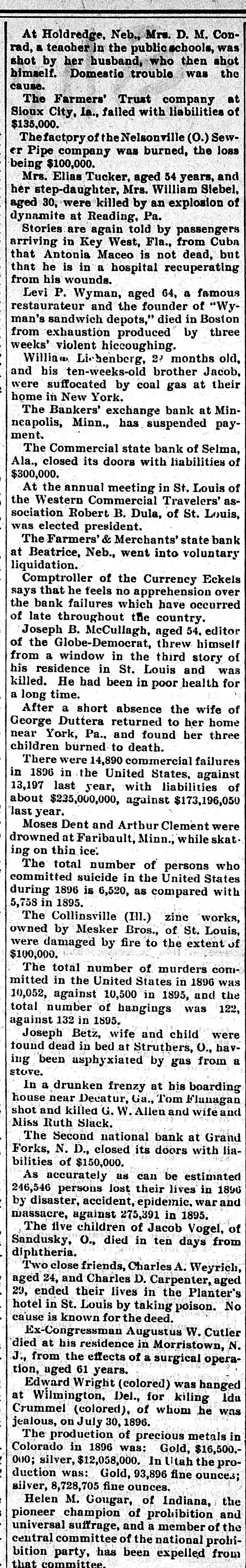 At Holdredge, Neb. Mrs. D. M. Conrad, a teacher in the public schools, was shot by her husband, who then shot himself. Domestic trouble was the cause. The Farmers' Trust company at Sioux City, Ia., failed with liabilities of $135,000. The factory of the Nelsonville (0.) Sewer Pipe company was burned, the loss being $100,000. Mrs. Elias Tucker, aged 54 years, and her step-daughter, Mrs. William Slebel, aged 30, were killed by an explosion of dynamite at Reading. Pa. Stories are again told by passengers in West, that is not arriving Antonia Key Maceo Fla., from dead, Cuba but that he is in a hospital recuperating from his wounds. Levi P. Wyman, aged 64, a famous and the man's sandwich from exhaustion produced restaurateur depots," founder died by in of Boston three "Wyweeks' violent hiccoughing Willia Lichenberg, 2? months old, and his ten-weeks-old brother Jacob, were suffocated by coal gas at their home in New York. The Bankers' exchange bank at Minncapolis, Minn., has suspended payment. The Commercial state bank of Selma, Ala., closed its doors with liabilities of $300,000. At the annual meeting in St. Louis of the Western Commercial Travelers' association Robert B. Dula, of St. Louis, was elected president. The Farmers' & Merchants' state bank at Beatrice, Neb., went into voluntary liquidation. Comptroller of the Currency Eckels says that he feels no apprehension over the bank failures which have occurred of late throughout the country. Joseph B. McCullagh, aged 54, editor of the Globe-Democrat, threw himself from a window in the third story of his residence in St. Louis and was killed. He had been in poor health for a long time. After a short absence the wife of George Duttera returned to her home near York, Pa., and found her three children burned to death. There were 14,890 commercial failures in 1896 in the United States, against 13,197 last year, with liabilities of about $235,000,000, against $173,196,050 last year. Moses Dent and Arthur Clement were drowned at Faribault, Minn.; while skat ing on thin ice: The total number of persons who committed suicide in the United States during 1896 is 6,520, as compared with 5,758 in 1895. The Collinsville (III.) zinc works, owned by Mesker Bros., of St. Louis, were damaged by fire to the extent of $100,000. The total number of murders committed in the United States in 1896 was 10,052, against 10,500 in 1895, and the total number of hangings was 122, against 132 in 1895. Joseph Betz, wife and child were tound dead in bed at Struthers, O., having been asphyxiated by gas from a stove. In a drunken frenzy at his boarding house near Decatur, Ga., Tom Flanagan shot and killed G. W. Allen and wife and Miss Ruth Slack. The Second national bank at Grand Forks, N. D., closed its doors with liabilities of $150,000. As accurately as can be estimated 246,546 persons lost their lives in 1896 by disaster, accident, epidemic. war and massacre, against 275,391 in 1895. The live children of Jacob Vogel, of Sandusky, O., died in ten days from diphtheria. Two close friends, Charles A. Weyrich, aged 24, and Charles D. Carpenter, aged 29, ended their lives in the Planter's hotel in St. Louis by taking poison. No cause is known for the deed. Ex-Congressman Augustus W. Cutler died at his residence in Morristown, N. J., from the effects of a surgical operation, aged 61 years. Edward Wright (colored) was hanged at Wilmington, Del., for kiling Ida Crummel (colored), of whom he was jealous, on July 30, 1896. The production of precious metals in Colorado in 1896 was: Gold, $16,500.000; silver, $12,058,000. In Utah the production was: Gold, 93,896 fine ounces; silver, 8,728,705 fine ounces. Helen M. Gougar, of Indiana, the pioneer champion of prohibition and universal suffrage, and a member of the central committee of the national prohibition party, has been expelled from that committee.