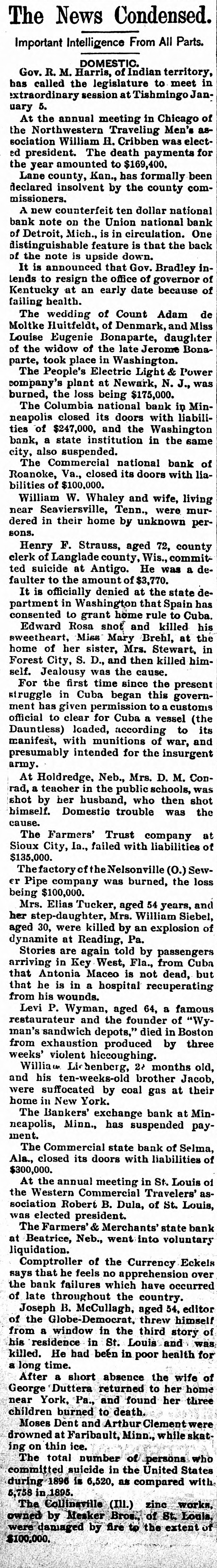 The News Condensed. Important Intelligence From All Parts. DOMESTIC. Gov. R. M. Harris, of Indian territory, has called the legislature to meet in extraordinary session at Tishmingo January 5. At the annual meeting in Chicago of the Northwestern Traveling Men's association William H. Cribben was elected president. The death payments for the year amounted to $169,400. Lane county, Kan., has formally been declared insolvent by the county commissioners. A new counterfeit ten dollar national bank note on the Union national bank of Detroit, Mich., is in circulation. One distinguishable feature is that the back of the note is upside down. It is announced that Gov. Bradley inlends to resign the office of governor of Kentucky at an early date because of failing health. The wedding of Count Adam de Moltke Huitfeldt, of Denmark, and Miss Louise Eugenie Bonaparte, daughter of the widow of the late Jerome Bonaparte, took place in Washington. The People's Electric Light & Power company's plant at Newark, N. J., was burned, the loss being $175,000. The Columbia national bank in Minneapolis closed its doors with liabilities of $247,000, and the Washington bank, a state institution in the same city, also suspended. The Commercial national bank of Roanoke, Va., closed its doors with liabilities of $100,000. William W. Whaley and wife, living near Seaviersville, Tenn., were murdered in their home by unknown persons. Henry F. Strauss, aged 72, county clerk of Langlade county, Wis., committed suicide at Antigo. He was a defaulter to the amount of $3,770. It is officially denied at the state department in Washington that Spain has consented to grant home rule to Cuba. Edward Rosa shot and killed his sweetheart, Miss Mary Brehl, at the home of her sister, Mrs. Stewart, in Forest City, S. D., and then killed himself. Jealousy was the cause. For the first time since the present struggle in Cuba began this government has given permission to a customs official to clear for Cuba a vessel (the Dauntless) loaded, according to its manifest, with munitions of war, and presumably intended for the insurgent army. At Holdredge, Neb., Mrs. D. M. Conrad, a teacher in the public schools, was shot by her husband, who then shot himself. Domestic trouble was the cause. The Farmers' Trust company at Sioux City, Ia., failed with liabilities of $135,000. The factory of the Nelsonville (0.) Sewer Pipe company was burned, the loss being $100,000. Mrs. Elias Tucker, aged 54 years, and her step-daughter, Mrs. William Siebel, aged 30, were killed by an explosion of dynamite at Reading, Pa. Stories are again told by passengers arriving in Key West, Fla., from Cuba that Antonia Maceo is not dead, but that he is in a hospital recuperating from his wounds. Levi P. Wyman, aged 64, a famous restaurateur and the founder of "Wyman's sandwich depots," died in Boston from exhaustion produced by three weeks' violent hiccoughing. Willia Lichenberg, 22 months old, and his ten-weeks-old brother Jacob, were suffocated by coal gas at their home in New York. The Bankers' exchange bank at Minneapolis, Minn., has suspended payment. The Commercial state bank of Selma, Ala., closed its doors with liabilities of $300,000. At the annual meeting in St. Louis of the Western Commercial Travelers' association Robert B. Dula, of St. Louis, was elected president. The Farmers' & Merchants' state bank at Beatrice, Neb., went into voluntary liquidation. Comptroller of the Currency Eckels says that he feels no apprehension over the bank failures which have occurred of late throughout the country. Joseph B. McCullagh, aged 54, editor of the Globe-Democrat, threw himself from a window in the third story of his residence in St. Louis and was killed. He had been in poor health for a long time. After a short absence the wife of George Duttera returned to her home near York, Pa., and found her three children burned to death. Moses Dent and Arthur Clement were drowned at Faribault, Minn., while skating on thin ice. The total number of persons who committed suicide in the United States during 1896 is 6,520, as compared with 5,758 in 1895. The Collinsville (III.) zinc works, owned by Mesker Bros., of St. Louis, were damaged by fire to the extent of $100,000.
