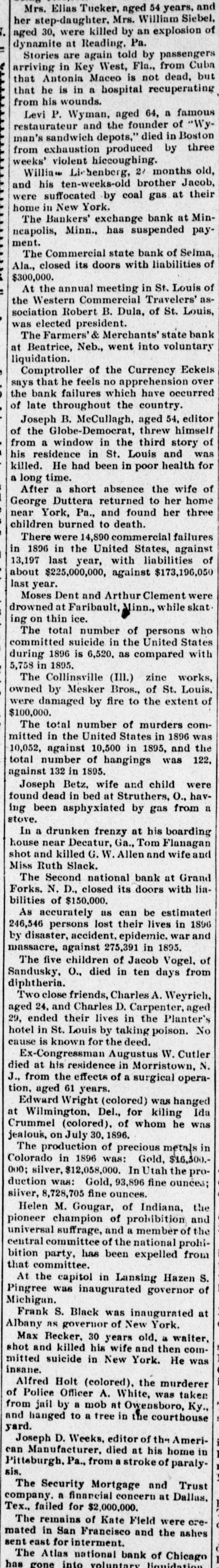 Mrs. Elias Tucker, aged 54 years, and er step-daughter, Mrs. William Siebel, red 30, were killed by an explosion of ynamite at Reading. Pa. Stories are again told by passengers riving in Key West, Fla., from Cuba at Antonia Maceo is not dead, but at he is in a hospital recuperating om his wounds. snourej B G pede 'd staurateur and the founder of "Wyan's sandwich depots," died in Boston om exhaustion produced by three eeks' violent hiecoughing. Willia Lichenberg, 2/ months old, d his ten-weeks-old brother Jacob, ere suffocated by coal gas at their York. MaN " auto The Bankers' exchange bank at Mincapolis, Minn., has suspended payent. The Commercial state bank of Selma, la., closed its doors with liabilities of 00,000. At the annual meeting in St. Louis of e Western Commercial Travelers' asciation Robert B. Dula, of St. Louis, as elected president. The Farmers'& Merchants' state bank Beatrice, Neb., went into voluntary Comptroller of the Currency Eckels ys that he feels no apprehension over e bank failures which have occurred late throughout the country. Joseph B. McCullagh, aged 54, editor the Globe-Democrat, threw himself om a window in the third story of si residence in St. Louis and was lled. He had been in poor health for long time. After a short absence the wife of eorge Duttera returned to her home ar York, Pa., and found her three ildren burned to death. There were 14,890 commercial failures 1896 in the United States, against ,197 last year, with liabilities of usuiede '000'000'922$ not year. 1s Moses Dent and Arthur Clement were owned at Faribault, inn., while skat. g on thin ice. The total number of persons who mmitted suicide in the United States ring 1896 is 6,520. as compared with 1895. u! 82. The Collinsville (III.) zine works, ned by Mesker Bros., of St. Louis. ere damaged by fire to the extent of *000*00 The total number of murders comtted in the United States in 1896 was ,052, against 10,500 in 1895, and the tal number of hangings was 122, 1895. u! 132 Joseph Betz, wife and child were und dead in bed at Struthers, O., havg been asphyxiated by gas from a **** In a drunken frenzy at his boarding use near Decatur, Ga., Tom Flanagan ot and killed G. W. Allen and wife and iss Ruth Slack. The Second national bank at Grand rks. N. D., closed its doors with lialities of $150,000. As accurately as can be estimated 6,546 persons lost their lives in 1896 disaster, accident. epidemic. war and against issucre, 275,391 in 1895. The five children of Jacob Vogel. of ndusky, O., died in ten days from ohtheria. Two close friends, Charles A. Weyrich, ed 24, and Charles D. Carpenter, aged ended their lives in the Planter's tel in St. Louis by taking poison. No use is known for the deed. Ex-Congressman Augustus W. Cutler ed at his residence in Morristown, N. from the effects of a surgical operan. aged 61 years. Edward Wright (colored) was hanged Wilmington, Del., for kiling Ida ummel (colored). of whom he was lous, on July 30, 1896. The production of precious metals in lorado in 1896 was: Gold, $16,500.; silver, $12,058,000. In Utah the pro908