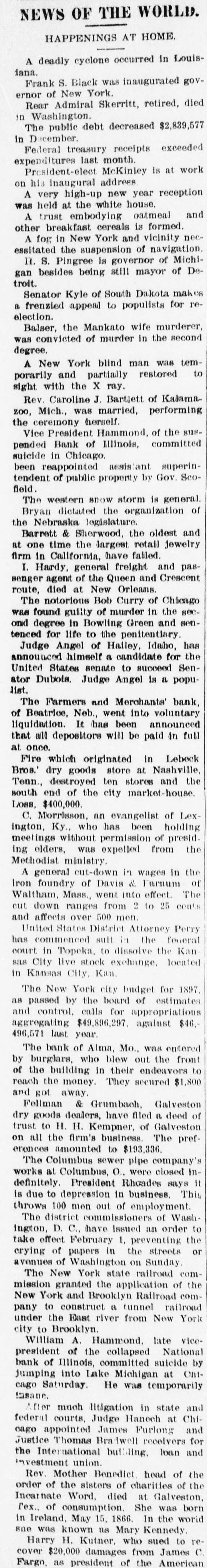 HAPPENINGS AT HOME. A deadly cyclone occurred in Louisiana. Frank S. Black was inaugurated governor of New York. Rear Admiral Skerritt, retired, died in Washington. The public debt decreased $2,839,577 in December. Federal treasury receipts exceeded expenditures last month. President-elect McKinley is at work on his inaugural address A very high-up new year reception was held at the white house. A trust embodying oatmeal and other breakfast cereals is formed. A fog in New York and vicinity necessitated the suspension of navigation. H. S. Pingree is governor of Michigan besides being still mayor of Detroit. Senator Kyle of South Dakota makes a frenzied appeal to populists for reelection. Balser, the Mankato wife murderer, was convicted of murder in the second degree. A New York blind man was temporarily and partially restored to sight with the X ray. Rev. Caroline J. Bartjett of Kalamazoo, Mich., was married, performing the ceremony herself. Vice President Hammond, of the suspended Bank of Illinois, committed suicide in Chicago. been reappointed assistant superintendent of public property by Gov. Scofield. The western snow storm is general. Bryan dictated the organization of the Nebraska legislature. Barrett & Sherwood, the oldest and at one time the largest retail jewelry firm in California, have failed. I. Hardy, general freight and passenger agent of the Queen and Crescent route, died at New Orleans. The notorious Bob Curry of Chicago was found guilty of murder in the secone degree in Bowling Green and sentenced for life to the penitentiary. Judge Angel of Hailey, Idaho, has announced himself a candidate for the United States senate to succeed Senator Dubois. Judge Angel is a populist. The Farmers and Merchants' bank, of Beatrice, Neb., went into voluntary liquidation. It has been announced that all depositors will be paid in full at once. Fire which originated in Lebeck Bros.' dry goods store at Nashville, Tenn., destroyed ten stores and the south end of the city market-house. Loss, $400,000. C. Morrisson, an evangelist of Lexington, Ky., who has been holding meetings without permission of presiding elders, was expelled from the Methodist ministry. A general cut-down in wages in the Iron foundry of Davis & Farnum of Waltham, Mass., went into effect. The cut down ranges from 2 to 25 cents and affects over 500 men. United States District Attorney Perry has commenced suit in the federal court in Topeka, to dissolve the Kansas City live stock exchange, located in Kansas City, Kan. The New York city budget for 1897. as passed by the board of estimates and control, calls for appropriations aggregating $49,896,297. against $46.496,571 last year. The bank of Alma, Mo., was entered by burglars, who blew out the front of the building in their endeavors to reach the money. They secured $1,800 and got away. Fellman & Grumbach, Galveston dry goods dealers, have filed a deed of trust to H. H. Kempner, of Galveston on all the firm's business. The preferences amounted to $193,336. The Columbus sewer pipe company's works at Columbus, O., were closed indefinitely. President Rhoades says It is due to depression in business. This throws 100 men out of employment. The district commissioners of Washington, D. C., have issued an order to take effect February 1, preventing the crying of papers in the streets or avenues of Washington on Sunday The New York state railroad commission granted the application of the