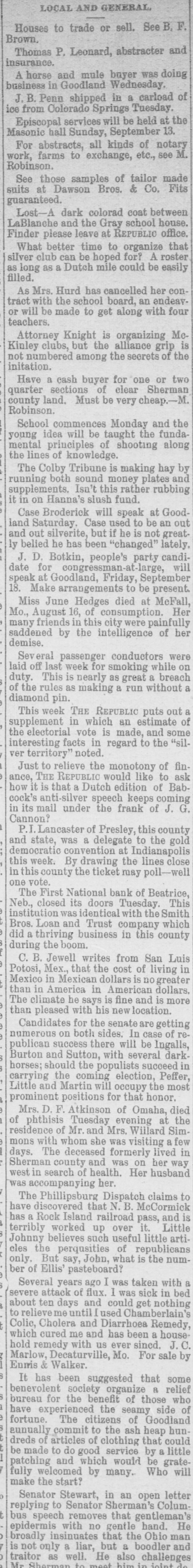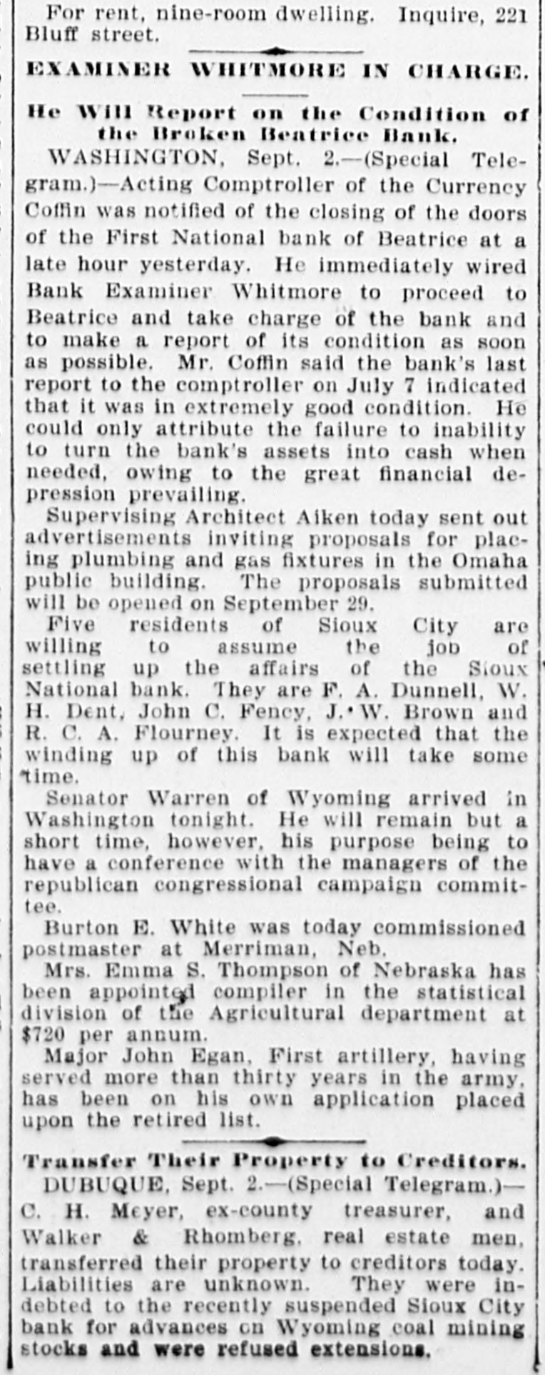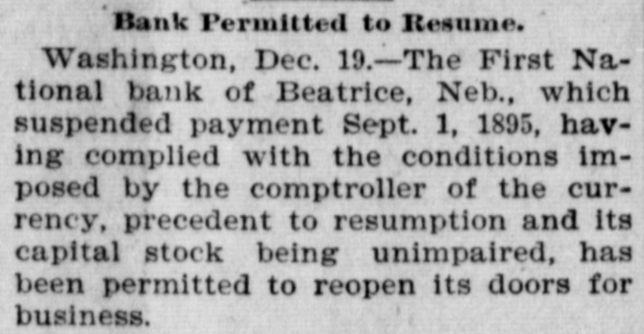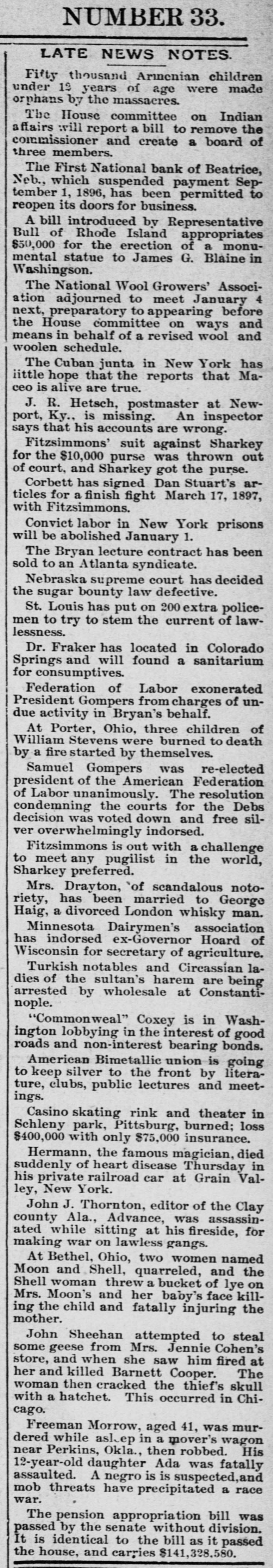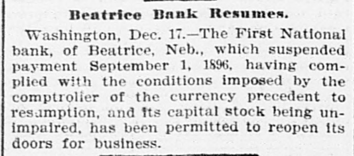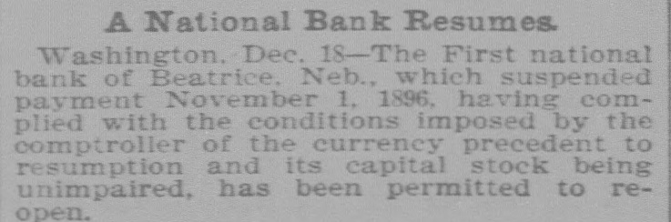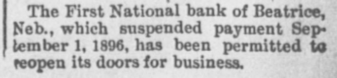NEBRASKA'S BALANCE SHEET State Treasurer Bartley's Biennial Report on Affairs of His Office. OVER A MILLION AND A HALF ON HAND Financial Transactions of the Last Two Years Show Accumulation of Cash, Outstanding Warrants and Delinquent Taxes. LINCOLN, Dec. 25.-(Special.)-In the introduction to his biennial report to the governor State Treasurer Bartley sets forth the following statement of receipts and disbursements for the period covered from the close of business November 30, 1894, to December 1, 1896. From the detailed exhibits are found: $1,121,387.34 Balance per last report Received November 30, 1894, to 3,667,594.95 December 1, 1896 $4,783,982.29 Total Disbursed November 30, 1894, to 3,059,354.99 December 1, 1896 Balance November 30, 1896 $1,729,627.30 From this amount are to be deducted the sums in suspended state depositories, as follows: $ 236,361.83 Capital National bank 4,499.00 Buffalo County National bank Globe Loan and Trust Company 12,892.54 Savings bank 14,965.57 Bank of Wymore First National bank of Beatrice. 2,803.14 $ 271,522.08 Total Balance 1,458,105.22 "During the present month," says the report, "the temporary school balance as per statement, $256,582.88, less amount in suspended depository banks ($24,624.58), will be apportioned and paid to the several counties, decreasing the cash in the state treasury at the time of this report to that amount. There is now in the state depository banks funds to apply upon the payment of registered general fund warrants in amount of $589,370.39. less amount in suspended depository banks, $58,453.36. which will, when applied, further reduce the cash balance to that extent. "In addition to general fund floating indebtedness shown in previous reports and occasioned largely by excess in appropriations over the amount raised by levy to meet the same, under a similar condition existing during the biennium for which this report is made, the floating indebtedness of the state has been further increased. "The appropriations for 1895-6 on general fund were $2,784,684.60; levy for the same period was $2,383,965.78; excess of appropriations, $400,718.82. Contributing to this excess was the unusual demand for relief requiring an appropriation of $250,000, and the reimbursing of the sinking fund for $180,000 lost in the Capital National state depository. "The outstanding registered general fund warrants November 30 are in amount $1,934,069.13, which, after deducting the cash on hand cited above to apply on same, have for their redemption the uncollected taxes of 1895-6, and delinquents from previous years, which from the statement of the auditor of public accounts, are $2,330,692.76, and if paid in will take up the entire out-
