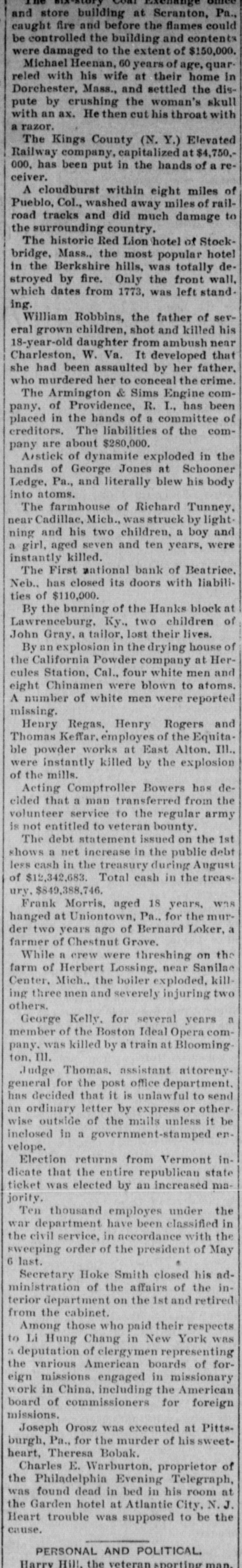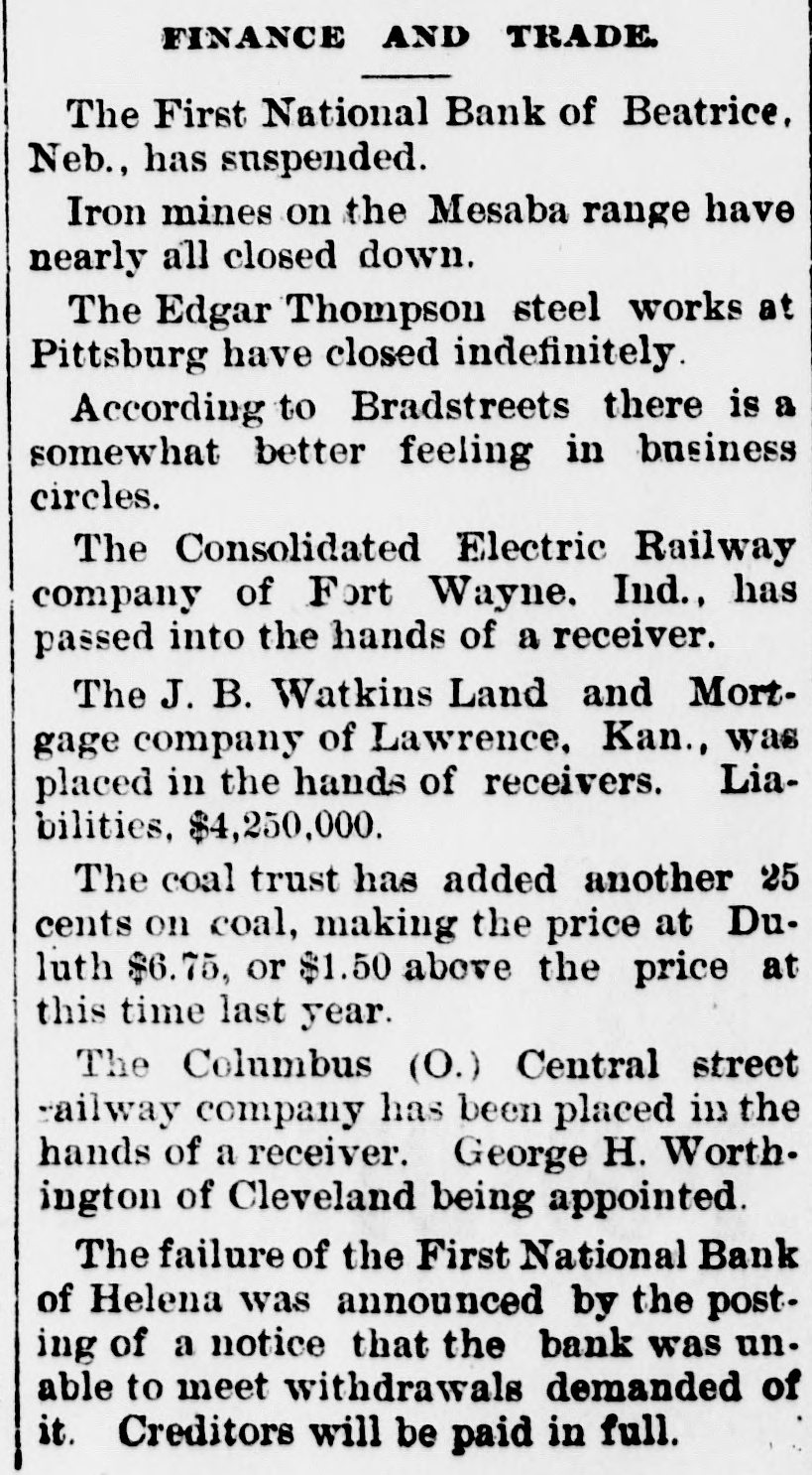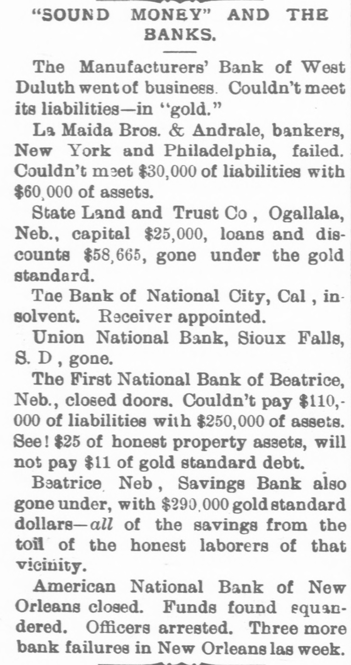 NEBRASKA'S BALANCE SHEET State Treasurer Bartley's Biennial Report on Affairs of His Office. OVER A MILLION AND A HALF ON HAND Financial Transactions of the Last Two Years Show Accumulation of Cash, Outstanding Warrants and Delinquent Taxes. LINCOLN, Dec. 25.-(Special.)-In the introduction to his biennial report to the governor State Treasurer Bartley sets forth the following statement of receipts and disbursements for the period covered from the close of business November 30, 1894, to December 1, 1896. From the detailed exhibits are found: $1,121,387.34 Balance per last report Received November 30, 1894, to 3,667,594.95 December 1, 1896 $4,783,982.29 Total Disbursed November 30, 1894, to 3,059,354.99 December 1, 1896 Balance November 30, 1896 $1,729,627.30 From this amount are to be deducted the sums in suspended state depositories, as follows: $ 236,361.83 Capital National bank 4,499.00 Buffalo County National bank Globe Loan and Trust Company 12,892.54 Savings bank 14,965.57 Bank of Wymore First National bank of Beatrice. 2,803.14 $ 271,522.08 Total Balance 1,458,105.22 "During the present month," says the report, "the temporary school balance as per statement, $256,582.88, less amount in suspended depository banks ($24,624.58), will be apportioned and paid to the several counties, decreasing the cash in the state treasury at the time of this report to that amount. There is now in the state depository banks funds to apply upon the payment of registered general fund warrants in amount of $589,370.39. less amount in suspended depository banks, $58,453.36. which will, when applied, further reduce the cash balance to that extent. "In addition to general fund floating indebtedness shown in previous reports and occasioned largely by excess in appropriations over the amount raised by levy to meet the same, under a similar condition existing during the biennium for which this report is made, the floating indebtedness of the state has been further increased. "The appropriations for 1895-6 on general fund were $2,784,684.60; levy for the same period was $2,383,965.78; excess of appropriations, $400,718.82. Contributing to this excess was the unusual demand for relief requiring an appropriation of $250,000, and the reimbursing of the sinking fund for $180,000 lost in the Capital National state depository. "The outstanding registered general fund warrants November 30 are in amount $1,934,069.13, which, after deducting the cash on hand cited above to apply on same, have for their redemption the uncollected taxes of 1895-6, and delinquents from previous years, which from the statement of the auditor of public accounts, are $2,330,692.76, and if paid in will take up the entire out-