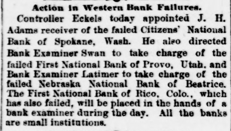 Action in Western Bank Failures. Controller Eckels today appointed J. H. Adams receiver of the failed Citizens' National Bank of Spokane, Wash. He also directed Bank Examiner Swan to take charge of the failed First National Bank of Provo, Utah. and Bank Examiner Latimer to take charge of the failed Nebraska National Bank of Beatrice. The First National Bank of Rico, Colo., which has also failed, will be placed in the hands of a bank examiner during the day. All the banks are small institutions.