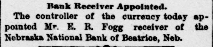 Bank Receiver Appointed. The controller of the currency today appointed Mr. E. R. Fogg receiver of the Nebraska National Bank of Beatrice, Neb.