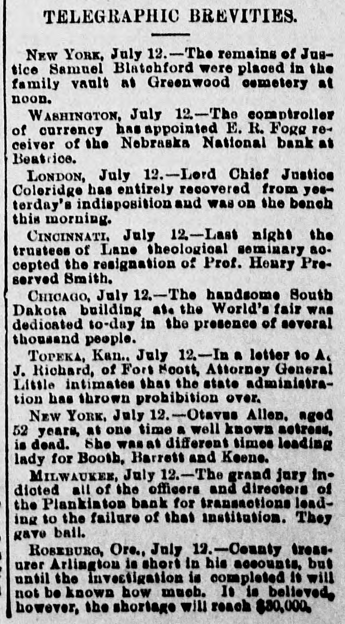 TELEGRAPHIC BREVITIES. NEW YORK, July 12.-The remains of Justice Samuel Blatchford were placed in the family vault as Greenwood cemetery at noon. WASHINGTON, July 12.-The comptroller of currency has appointed E. R. Foga receiver of the Nebraska National bank at Beatrice. LONDON, July 12.-Lord Chief Justice Coloridge has entirely recovered from yesterday's indisposition and was on the bench this morning. CINCINNATI. July 12.-Last night the trustees of Lane theological seminary ao. cepted the resignation of Prof. Henry Preserved Smith. CHICAGO, July 12. -The handsome South Dakota building ate the World's fair was dedicated to-day in the presence of several thousand people. TOPEKA, Kan.. July 12.-In a letter to A. J. Richard, of Fort Moost, Attorney General Little intimates thas the state administration has thrown prohibition over. NEW YORK, July 12.-Otavus Allen. aged 52 years, as one time a well known actress, is dend. She wasat different times leading lady for Booth, Barrett and Keene. MILWAUKEE, July 12.-The grand jury in. dioted all of the officers and directors of the Plankinton bank for transactions loading to the failure of that institution. They gave bail. ROSEBURG, Ore., July 12.-County treas. urer Arlington is short in his accounts, but until the investigation is completed 10 will not be known how much. It is believed, however, the shortage will reach $30,000.