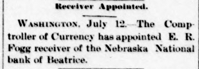 Receiver Appointed. WASHINGTON, July 12. The Comp troller of Currency has appointed E. R. Fogg receiver of the Nebraska National bank of Beatrice.