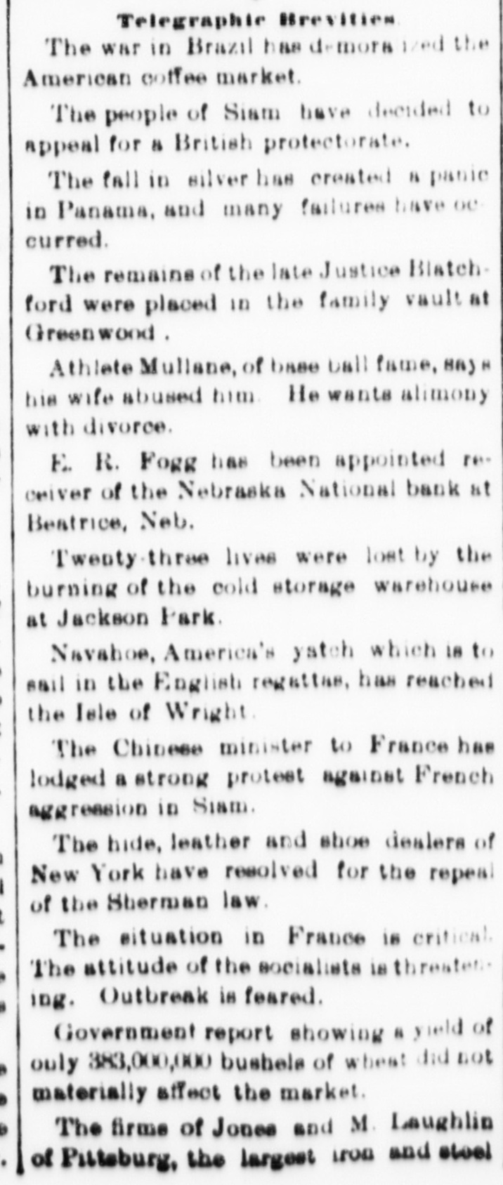 Telegraphic Brevities The war in Brazil has demora ized the American coffee market. The people of Siam have decided to appeal for H British protectorate. The fall in silver has created is panic in Panama, and many failures have oc curred. The remains of the late Justice Blatch ford were placed in the family vault at Greenwood . Athlete Mullane, of base ball fame, 88) H his wife abused him. He wants alimony with divorce. E. R. Fogg has been appointed receiver of the Nebraska National bank at Beatrice, Neb. Twenty-three lives were lost by the burning of the cold storage warehouse at Jackson Park Navahoe, America's yatch which 18 to sail in the English regattas. has reached the Iele of Wright The Chinese minister to France has lodged a strong protest against French aggression in Siam. The hide, leather and shoe dealers of New York have resolved for the repeal of the Sherman law. The situation in France is critical The attitude of the socialists is threaten. ing. Outbreak is feared. Government report showing a yield of only 383,000,000 bushels of wheat did not materially affect the market. The firms of Jones and M. Laughlin of Pittsburg, the largest LOO and stool