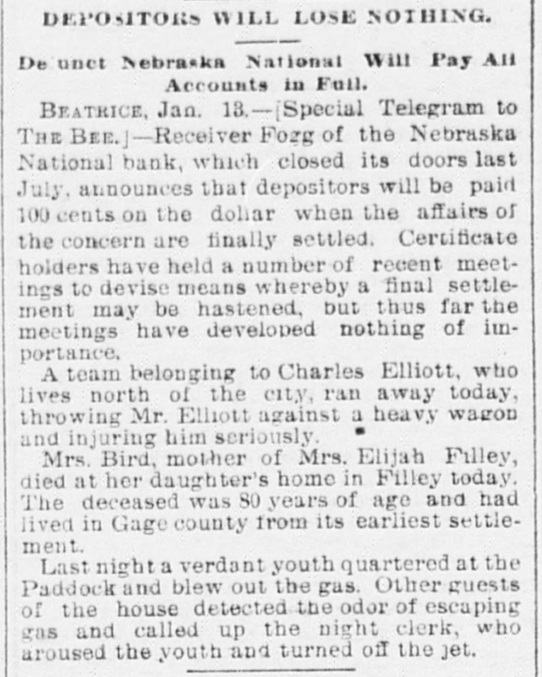 DEPOSITORS WILL LOSE NOTHING. De unet Nebraska National Will Pay All Accounts in Full. BEATRICE, Jan. 18,-[Special Telegram to THE BEE.J-Receiver Forg of the Nebraska National bank, which closed its doors last July, announces that depositors will be paid 100 cents on the dollar when the affairs of the concern are finally settled. Certificate holders have held a number of recent meetings to devise means whereby a final settlement may be hastened, but thus far the meetings have developed nothing of itnportance. A team belonging to Charles Elliott, who lives north of the city, ran away today, throwing Mr. Elliott against a heavy wagon and injuring him seriously. Mrs. Bird, mother of Mrs. Elijah Filley, died at her daughter's home in Filley today. The deceased was 80 years of age and had lived in Gage county from its earliest settlement. Last night a verdant youth quartered at the Paddock and blew out the gas. Other guests of the house detected the odor of escaping gas and called up the night clerk, who aroused the youth and turned off the jet.