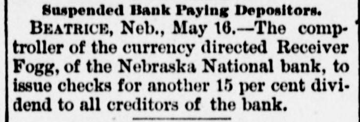 Suspended Bank Paying Depositors. BEATRICE, Neb., May 16.-The comptroller of the currency directed Receiver Fogg, of the Nebraska National bank, to issue checks for another 15 per cent dividend to all creditors of the bank.