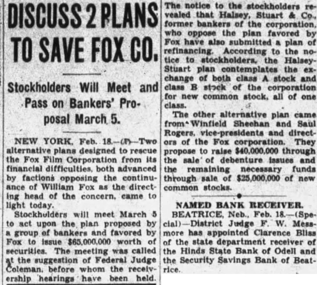 DISCUSS PLANS TO SAVE FOX CO. Stockholders Will Meet and Pass on Bankers' Proposal March 5. NEW YORK. Feb. alternative plans designed to rescue the Fox Film Corporation from its financial difficulties both advanced by factions opposing the continuance of William Fox as the direct of the came light today. Stockholders will meet March to act upon the plan proposed of bankers favored by Fox to $65,000,000 worth securities. The meeting was called the suggestion of Federal Judge Coleman. before whom the receivership hearings have been held The notice to the stockholders revealed that Halsey, Stuart & Co., former bankers of the corporation, who oppose the plan favored by Fox have also submitted a plan of refinancing According to the notice to stockholders. the HalseyStuart plan the exchange of both class A stock and class B stock of the for new common stock, all of one class. The other alternative plan came from Winfield Sheehan and Saul Rogers, vice-presidents and directors of the Fox corporation. They propose to raise $40,000,000 through the sale of debenture issues and the remaining necessary funds through sale of $25,000,000 of new common stocks. NAMED BANK RECEIVER. BEATRICE Neb., Feb. clal). District Judge F. W. Messhas appointed Clarence Bliss of the state department receiver of the Hinds State Bank of Odell and the Security Savings Bank of Beat-