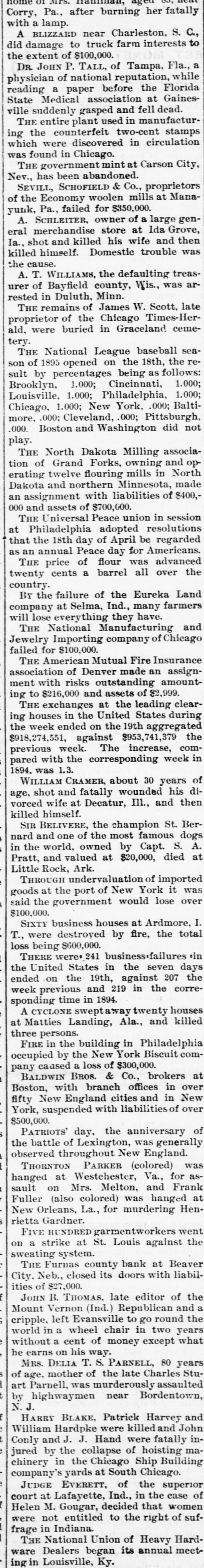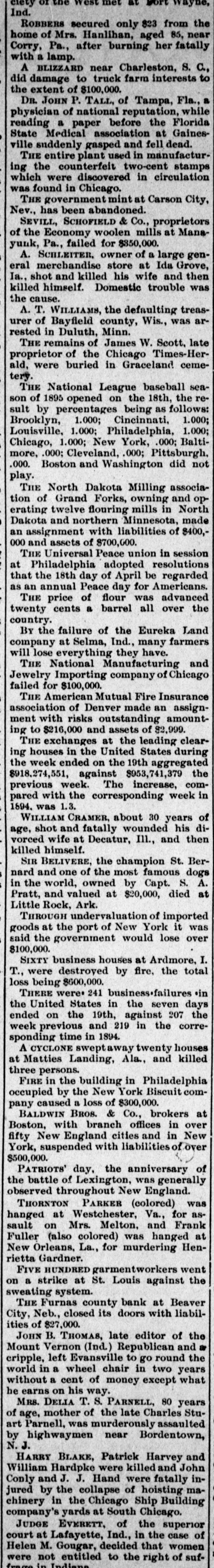 the agreest previous week. The increase, compared with the corresponding week in 1894. was 1.3. WILLIAM CRAMER, about 30 years of age, shot and fatally wounded his divorced wife at Decatur, Ill., and then killed himself. SIR BELIVERE, the champion St. Bernard and one of the most famous dogs in the world, owned by Capt. S. A. Pratt, and valued at $20,000, died at Little Rock, Ark. THROUGH undervaluation of imported goods at the port of New York it was said the government would lose over $100,000. SIXTY business houses at Ardmore, I. T., were destroyed by fire, the total loss being $600,000. THERE were' 241 businessfailures in the United States in the seven days ended on the 19th, against 207 the week previous and 219 in the corresponding time in 1894. A CYCLONE sweptaway twenty houses at Matties Landing, Ala., and killed three persons. FIRE in the building in Philadelphia occupied by the New York Biscuit company caused a loss of $300,000. BALDWIN BROS. & Co., brokers at Boston, with branch offices in over fifty New England cities and in New York, suspended with liabilities of over $500,000. PATRIOTS' day, the anniversary of the battle of Lexington, was generally observed throughout New England. THORNTON PARKER (colored) was hanged at Westchester, Va., for assault on Mrs. Melton, and Frank Fuller (also colored) was hanged at New Orleans, La., for murdering Henrietta Gardner. FIVE HUNDRED garmentworkers went on a strike at St. Louis against the sweating system. THE Furnas county bank at Beaver City, Neb., closed its doors with liabilities of $27,000. JOHN B. THOMAS, late editor of the Mount Vernon (Ind.) Republican and a cripple, left Evansville to go round the world in a wheel chair in two years without a cent of money except what he earns on his way. MRS. DELIA T. S. PARNELL, 80 years of age, mother of the late Charles Stuart Parnell, was murderously assaulted by highwaymen near Bordentown, '[ N HARRY BLAKE, Patrick Harvey and William Hardpke were killed and John Conly and J. J. Hand were fatally injured by the collapse of hoisting machinery in the Chicago Ship Building company's yards at South Chicago. JUDGE EVERETT, of the superior court at Lafayette, Ind., in the case of Helen M. Gougar, decided that women were not entitled to the right of suffrage in Indiana. THE National Union of Heavy Hardware Dealers began its annual meeting in Louisville, Ky. THE percentages of the baseball clubs in the National league for the week ended on the 20th were: Boston, 1.000; Cincinnati, 1.000; Pittsburgh, .667; Chicago, .667; New York .500; Brookyn, .500; Baltimore, .500; Philadelphia, 500; St. Louis, .333; Louisville, .333; '000' :000* A TRAIN on the Philadelphia & Readng railroad struck a wagon containng Mr. and Mrs. Henry Frank, aged 2 and 65 respectively, near Richland, Pa., and both were instantly killed. THE Chicago Times-Herald and the Chicago Evening Post were purchased Rohnsant "H "H "W Aq THE forty-second regular session of the Wisconsin legislature adjourned sine die. THE First national bank of Ocala, Fla., closed it doors. LAKESIDE, a summer resort on Pewaukee lake, about twenty miles east of Milwaukee, was destroyed by fire. DURING a storm at Fort Worth, Tex., a portion of the roof of the tabernacle rave way and fell on part of an audince of 10,000 listening to Evangelist Dwight Moody, fifty persons being inured. MATTHEW CALLOWAY, a negro who nurdered Jim Walters (colored) at Santa Fe in July last, was executed at Columbia, Tenn. JULIUS and Ernst Haefelin and John Miller were drowned in the Delaware river at Philadelphia by the upsetting f a boat. HENRY A. SHIRLEY and James S. Amerton, English capitalists, were irowned south of San Antonio, Tex. HENRY WILLIAMS, of Hillsboro, Tex., killed his wife because she refused to ret up and make breakfast and then oisoned himself. ALL persons using profane or vulgar anguage on the streetsof McKeesport, 'a., will be arrested by order of the nayor. AFTER serving continuously in the ervice of the United States for period f forty-three years, Maj. Gen. Alexnder McDowell McCook retires from he army, the age of 64 years having een reached.