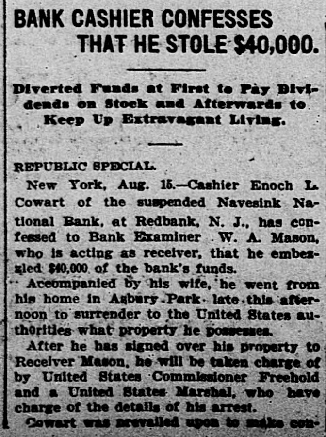 CASHIER E.L. COWARTH ADMITS EMBEZZLEMENT Navesink National Bank Expected to Pay Depositors. NEW YORK, Aug. 15.-Eugene L. Cowarth, cashier of the suspended Navesink National Bank, of Red Bank, N. J., acting upon the advice of Federal Bank Examiner W. A: Mason, today surrendered himself to the United States marshal and admitted that he had embezzled $40,000 of the bank's funds. He was arraigned before United States Commissioner Freehold and held in $10,000 bail. Mr. Cowarth said he had first taken the money in order to pay dividends on the stock in order to keep up its price, and later took more money to conduct an extravagant establishment which he had at Asbury Park. It is probable that the depositors will be paid in full and the bank will be permitted to resume business.