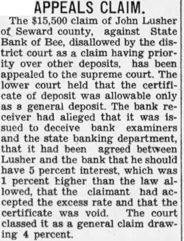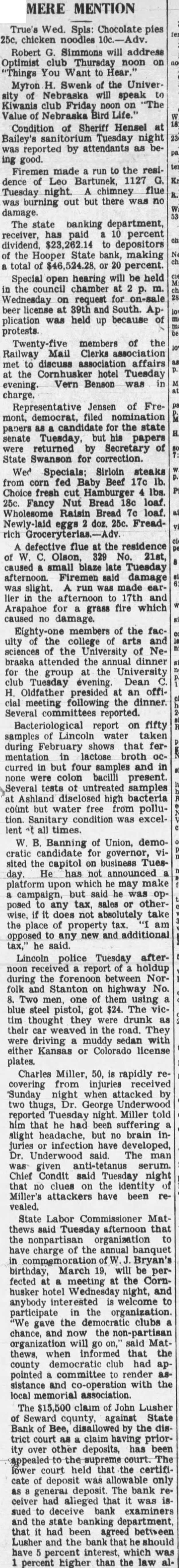 True's Wed. Spls: Chocolate pies 25c, chicken noodles 10c.-Adv. Robert G. Simmons will address Optimist club Thursday noon on "Things You Want to Hear Myron H. Swenk of the University of Nebraska will speak to Kiwanis club Friday noon on "The Value Nebraska Bird Life." Condition of Sheriff Hensel at Bailey's Tuesday night was reported by attendants as bepage ing good. Firemen made run to the residence of Leo Bartunek, 1127 G. Tuesday night. chimney flue was burning out but there was no The state banking department, receiver, has paid 10 percent dividend, $23,262.14 to depositors of the Hooper State bank, making a total of $46,524.28 or 20 percent. Special open hearing will be held ciety in the council chamber at 2 p. m. Wednesday on request for on-sale beer license at 39th and South. Application was held up because of protests. Twenty-five members of the Railway Mail Clerks association met to discuss association affairs at the Cornhusker hotel Tuesday evening. Vern Benson was in charge. Representative Jensen of Fremont, democrat, filed nomination papers as candidate for the state senate Tuesday, but his papers were returned by Secretary of State Swanson for correction. Wed Specials: Sirloin steaks from corn fed Baby Beef 17c lb. Pill Choice fresh cut Hamburger lbs. 25c. Fancy Nut Bread 18c loaf. Wholesome Raisin Bread Newly-laid eggs 2 doz. 25c. Freadrich Groceryterias.-Adv. A defective flue at the residence of W. C. Olson, 329 No. 21st, caused small blaze late Tuesday afternoon. Firemen said damage was slight. A run was made earlier in the afternoon to 17th and Arapahoe for grass fire which caused no damage. Eighty-one members of the faculty of the college of arts and sciences of the University of Nebraska attended the annual dinner for the group at the University club Tuesday evening. Dean H. Oldfather presided at an official meeting following the dinner. Several committees reported. Bacteriological report on fifty samples Lincoln water taken during February shows that fermentation in lactose broth OCcurred in but four samples and in none were colon bacilli present. Several tests of untreated samples at Ashland disclosed high bacteria count but water free from pollution. Sanitary condition was excellent all times. W. B. Banning of Union, demo- of cratic candidate for governor, visited the capitol on business Tuesday. He has not announced platform upon which he may make campaign, but said he was opposed any tax, sales or otherwise, does not absolutely take the place of property tax. am opposed to any new and additional tax,' he said. Lincoln police Tuesday afternoon a report of holdup during the forenoon between folk and Stanton on highway No. 8. Two men, of them using blue steel pistol, got $24. The victim thought they were drunk as their car the road. They were driving a muddy sedan with either Kansas or Colorado license plates. Charles Miller, 50, is rapidly recovering from injuries "Sunday night when attacked by two thugs, Dr. George Underwood reported Tuesday night. Miller told him that he had been suffering slight headache, but no brain injuries infection have developed, Dr. Underwood The man was given anti-tetanus serum. Chief Condit said Tuesday night that no clues on the identity of Miller's attackers have been revealed. State Labor Commissioner Matthews said Tuesday afternoon that the nonpartisan organization to have charge of the annual banquet in commemoration Bryan's birthday, March 19, will be perfected at meeting at the Cornhusker hotel Wednesday night, and anybody interested is welcome to participate in the organization. "We gave the democratic clubs chance, and now the non-partisan organization will go on, said Matthews, informed that the county democratic club had appointed committee render assistance and co-operation with the memorial association. The $15,500 claim of John Lusher of Seward county, against State Bank of Bee, disallowed by the district court as claim having priority over other deposits, has been appealed to the supreme court. The lower court held that the certificate of deposit was allowable only as general deposit. The bank receiver alieged that it was issued to deceive bank examiners and the state banking department, that it had been agreed between Lusher and the bank that he should have percent interest, which was percent higher than the law al-