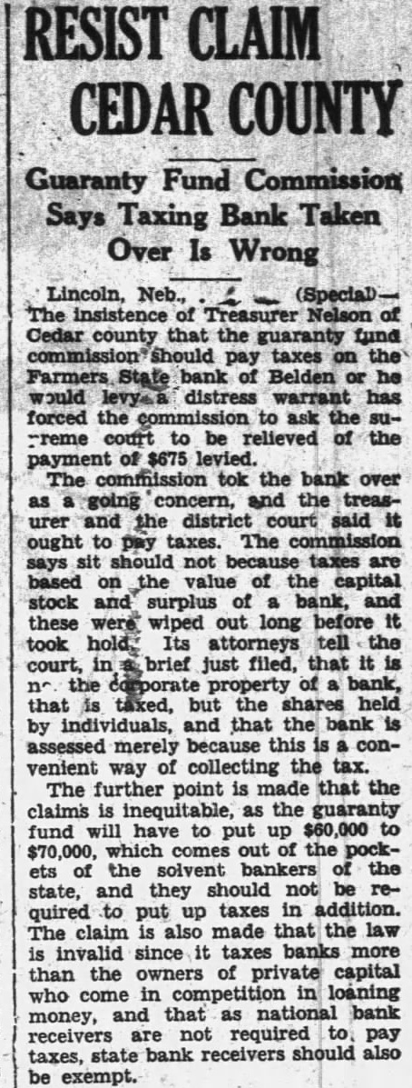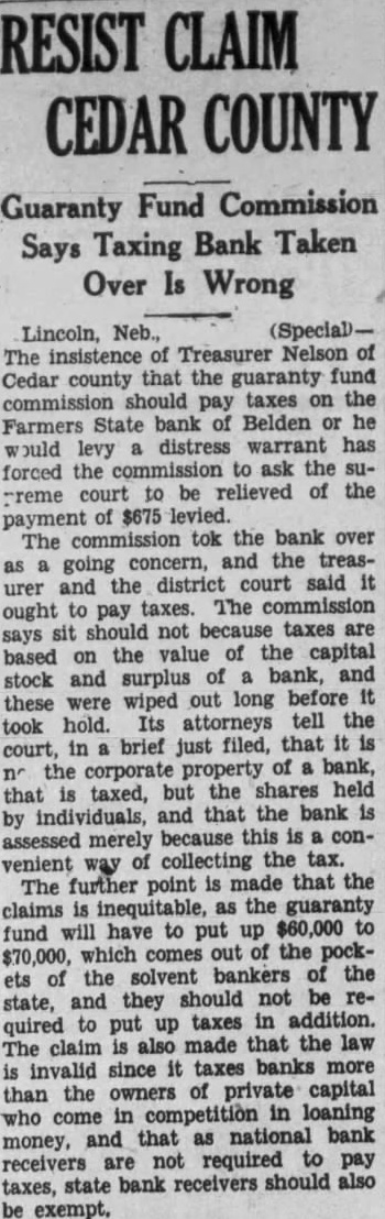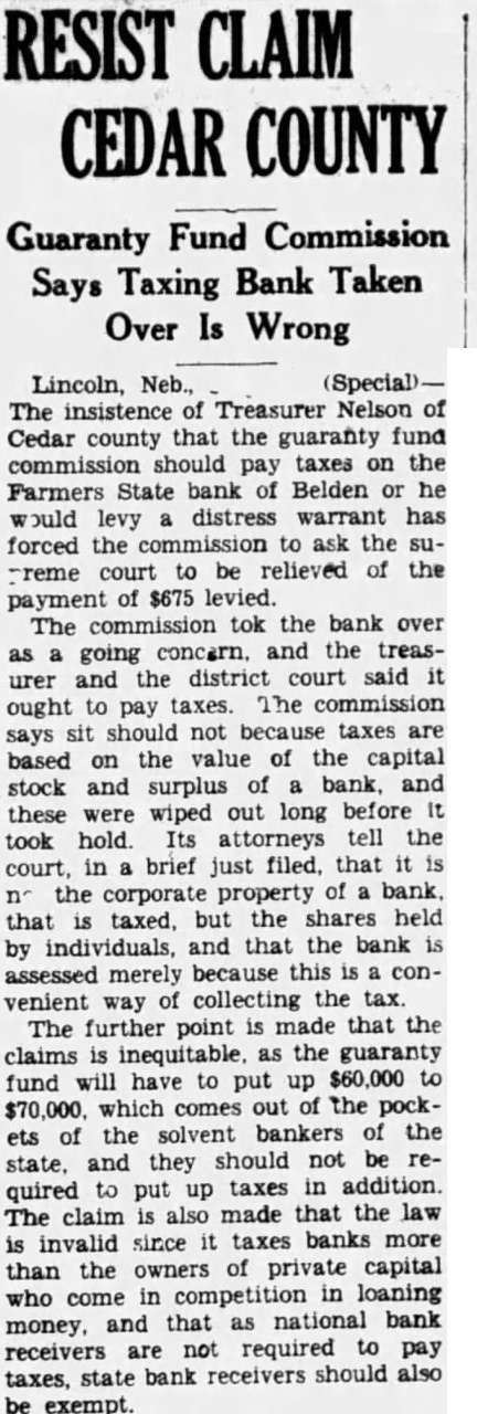 Lincoln, Neb., The insistence of Treasurer Nelson of Cedar county that the guaranty fund commission should pay taxes on the Farmers State bank of Belden or he would levy a distress warrant has forced the commission to ask the supreme court to be relieved of the payment of $675 levied. The commission tok the bank over as a going concern, and the treasurer and the district court said it ought to pay taxes. The commission says sit should not because taxes are based on the value of the capital stock and surplus of a bank, and these were wiped out long before it took hold. Its attorneys tell the court, in a brief\just filed, that it is no the corporate property of a bank, that is taxed, but the shares held by individuals, and that the bank is assessed merely because this is a convenient way of collecting the tax. The further point is made that the claims is inequitable, as the guaranty fund will have to put up $60,000 to $70,000, which comes out of the pockets of the solvent bankers of the state, and they should not be required to put up taxes in addition. The claim is also made that the law is invalid since it taxes banks more than the owners of private capital who come in competition in loaning money, and that as national bank receivers are not required to pay taxes, state bank receivers should also be exempt.