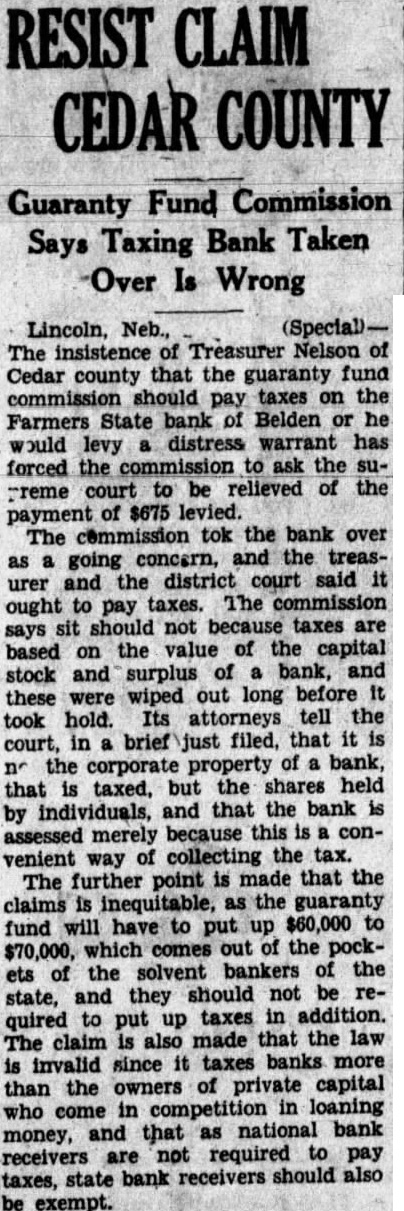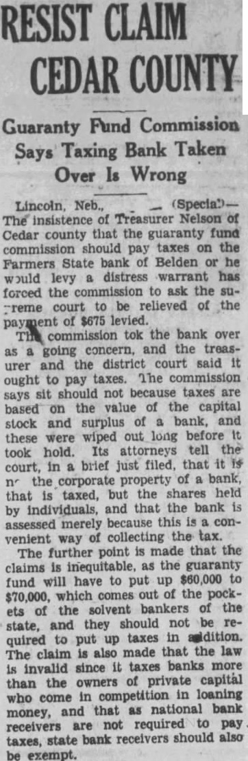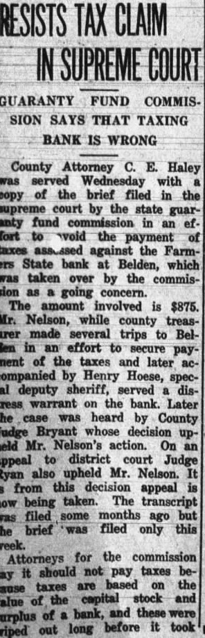 County Attorney C. E. Haley was served with copy of the brief filed in the supreme court by the state guaranty fund commission in an ef fort to woid the payment of taxes against the Farmers State bank at Belden, which was taken over by the commission as going concern. The amount involved is $875. Mr. Nelson, while county treasarer made several trips to Belden in an effort to secure payment of the taxes and later accompanied by Henry Hoese, special deputy sheriff, served distress warrant on the bank. Later the case was heard by County Judge Bryant whose decision upheld Mr. Nelson's action. On an appeal to district court Judge Ryan also upheld Mr. Nelson. It from this decision appeal now being taken. The transcript was filed some months ago but the brief was filed only this week. Attorneys for the commission say it should not pay taxes betaxes are based on the value of the capital stock and surplus of bank, and wiped out long before it took