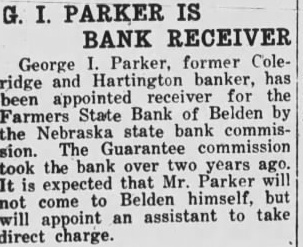 G. I. PARKER IS BANK RECEIVER George Parker, former Coleridge Hartington banker, for been Farmers State Bank of Belden by the Nebraska state bank commission. The commission took the bank over two years expected that Mr. Parker come Belden himself, but will appoint an assistant to take direct charge.