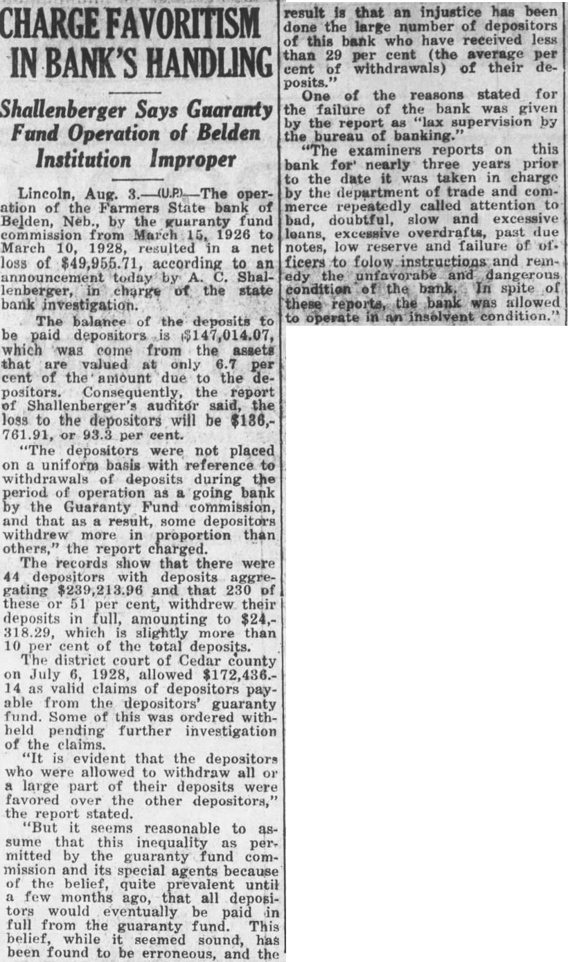 CHARGE FAVORITISM IN BANK'S HANDLING Shallenberger Says Guaranty Fund Operation of Belden Institution Improper Lincoln, Aug. 3.-(U.P.)--The operation of the Farmers State bank of Belden, Neb., by the guaranty fund commission from March 15, 1926 to March 10, 1928, resulted in a net loss of $49,955.71, according to an announcement today by A. C. Shallenberger, in charge of the state bank investigation. The balance of the deposits to be paid depositors is $147,014.07, which was come from the assets that are valued at only 6.7 per cent of the amount due to the depositors. Consequently, the report of Shallenberger's auditor said, the loss to the depositors will be $136,761.91, or 93.3 per cent. "The depositors were not placed on a uniform basis with reference to withdrawals of deposits during the period of operation as a going bank by the Guaranty Fund commission, and that as a result, some depositors withdrew more in proportion than others," the report charged. The records show that there were 44 depositors with deposits aggregating $239,213.96 and that 230 of these or 51 per cent, withdrew their deposits in full, amounting to $24,318.29, which is slightly more than 10 per cent of the total deposits. The district court of Cedar county on July 6, 1928, allowed $172,436.14 as valid claims of depositors payable from the depositors' guaranty fund. Some of this was ordered withheld pending further investigation of the claims. "It is evident that the depositors who were allowed to withdraw all or a large part of their deposits were favored over the other depositors,' the report stated. "But it seems reasonable to assume that this inequality as permitted by the guaranty fund commission and its special agents because of the belief, quite prevalent until a few months ago, that all depositors would eventually be paid in full from the guaranty fund. This belief, while it seemed sound, has been found to be erroneous, and the result is that an injustice has been done the large number of depositors of this bank who have received less than 29 per cent (the average per cent of withdrawals) of their deposits." One of the reasons stated for the failure of the bank was given by the report as "lax supervision by the bureau of banking. "The examiners reports on this bank for' nearly three years prior to the date it was taken in charge by the department of trade and commerce repeatedly called attention to bad, doubtful, slow and excessive leans, excessive overdrafts, past due notes, low reserve and failure of of. ficers to folow instructions and remedy the unfavorabe and dangerous condition of the bank. In spite of these reports, the bank was allowed to operate in an insolvent condition.