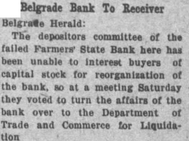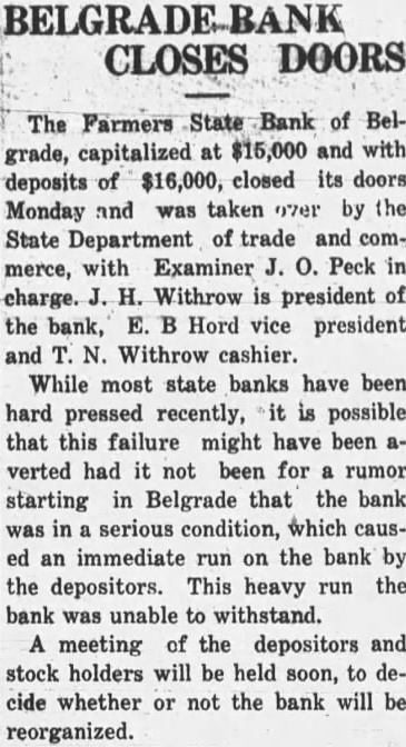 BELGRADE CLOSES DOORS The Farmers State Bank of Belgrade, capitalized at $15,000 and with deposits of $16,000, closed its doors Monday and was taken over by the State Department of trade and commerce, with Examiner J. O. Peck in charge. J. H. Withrow is president of the bank, E. B Hord vice president and T. N. Withrow cashier. While most state banks have been hard pressed recently, it is possible that this failure might have been averted had it not been for a rumor starting in Belgrade that the bank was in serious condition, which caused an immediate run on the bank by the depositors. This heavy run the bank was unable to withstand. A meeting of the depositors and stock holders will be held soon, to decide whether or not the bank will be reorganized.