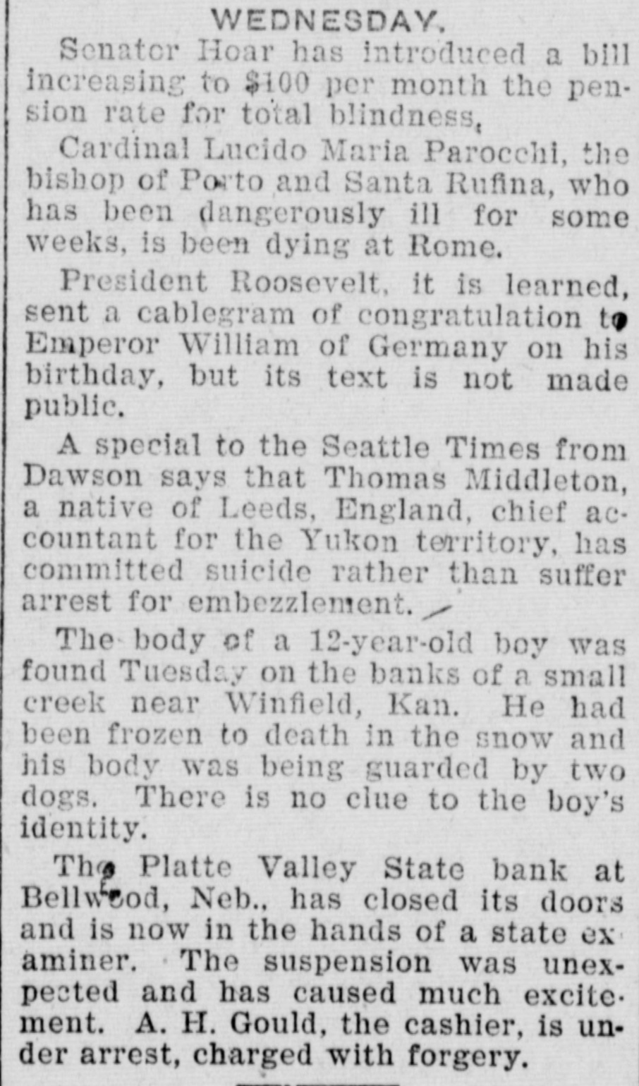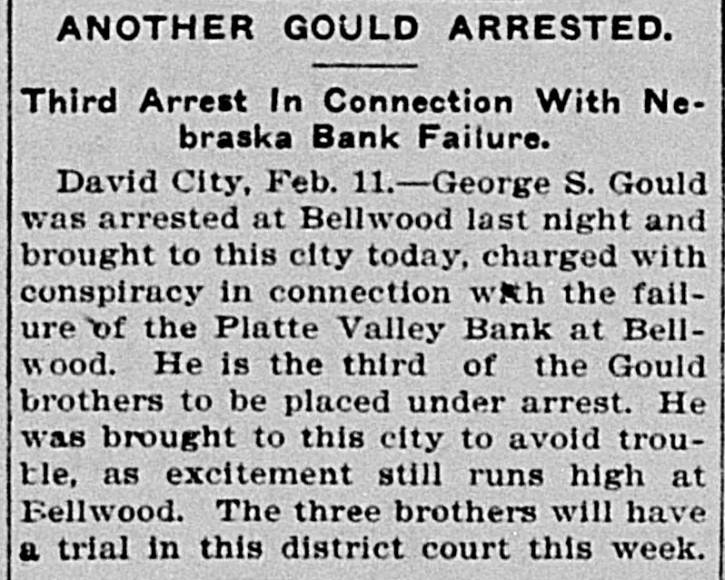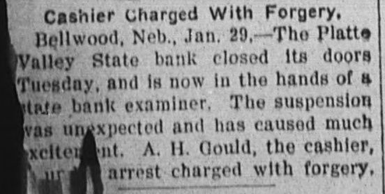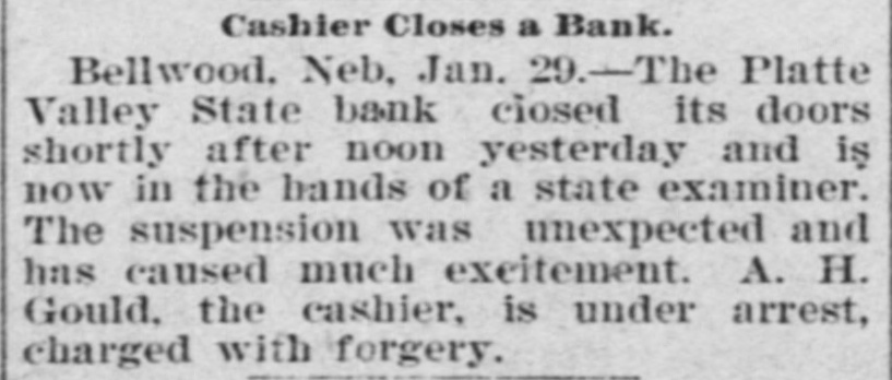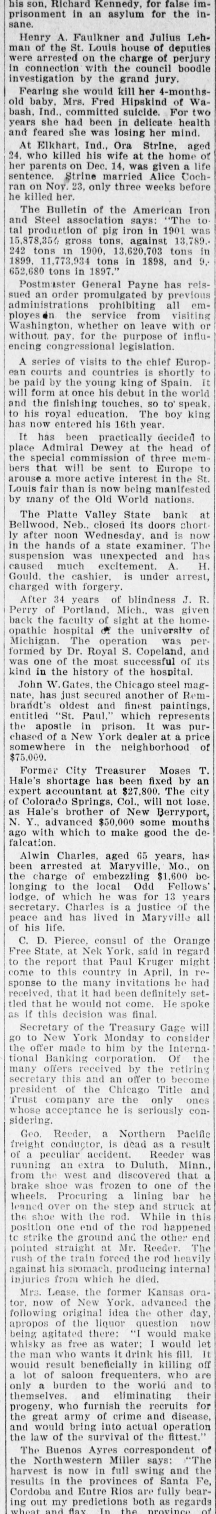 BUSINESS FAILVRES. Jan. 10-Cleveland, O., Euclid Trust & Savings Co.; $1,500,000. 11-Painesville, O., People's bank; $173,000. 14-Chicago, Geo. H. Phillips, "corn king," fails for second time in 7 months. 17-Albany, Ga., Commercial bank; $123,000. 28-Bellwood, Neb., Platte Valley state bank. Feb. 10-Detroit, Mich., City savings bank, on account of shortage of Vice President Frank C. Andrews. 25.-Belmont (O.) national bank. 26-Burnett, Tex., private bank of W. H. Westfall & Co. Mar. 3-Elkhart, Ill., State bank. 15-Wanatah, Ind., Julius Conitz, banker. 20-Americus, Ga., People's bank; $30,000. Apr. 4-St. Paul, U. S. Saving & Loan Co.; $800,000. 24-Algonac (Mich.) Banking Co.'s bank; $32,000. Jun. 3-Chicago, John A. & Alexander Davidson, marble contractors; $1,391,838. 13-Charleston (S. C.) Exposition Co., placed in receivers' hands; $450,000. 30-Murdock, Neb., German state bank; $37,000. Jul. 3-New York city, M. P. Anderson, real estate operator; $1,535,212. 29-Brooklyn, N. Y., Malcolm Brewing Co.; $800,000. Aug. 16-Elgin, III., Obadiah Sands Butter corporation, $445,000. 20-Cleveland, O., Forward Reduction Co., booming Texas oil; $500,000. 24-Elnora (Ind.) bank $10,000. Sep. 2-New York, American bicycle trust. 30-Trenton, N. J., National Salt Co. ("salt trust"); $300,000. Oct. 7-Oto Ia., bank of F. H. Cutting & J. T. Willett: $20,000. 16-New York, Gillman, Son & Co's banking house; $200,000. Nov. 5-Richmond, Va., Leon L. Strause, leaf tobacco; $300,500. 13-Boston, Central national bank. Dec. 8-Omaha, W. H. Bennett Co.'s. department store.