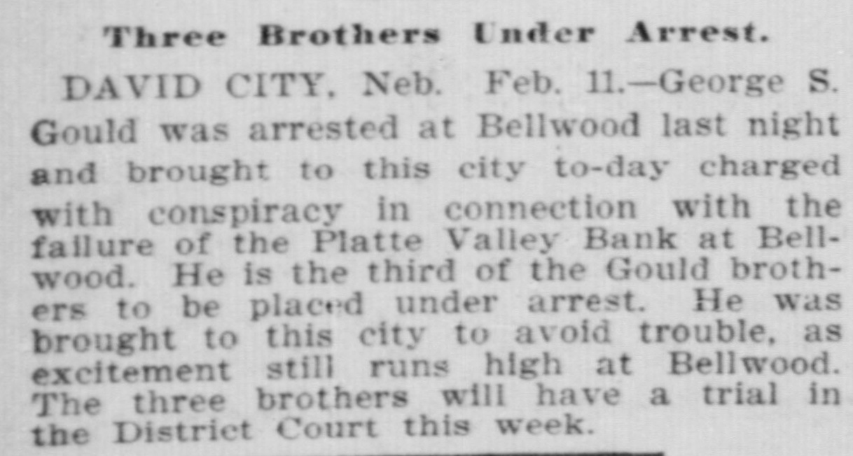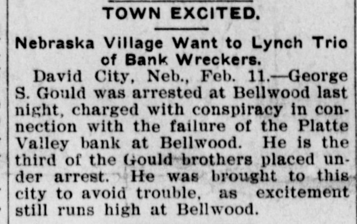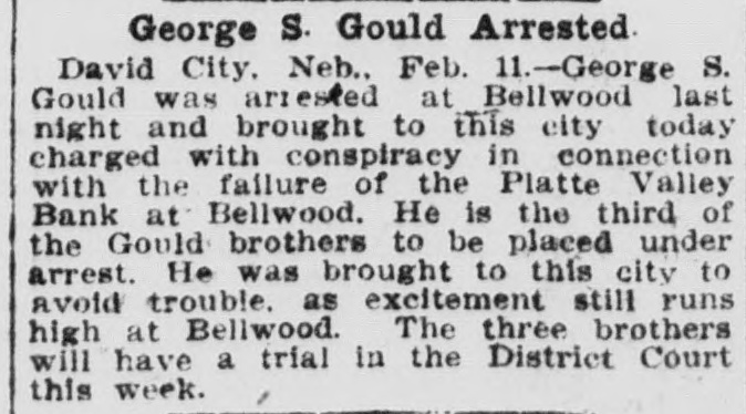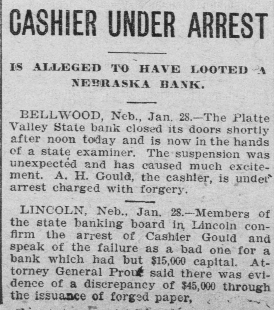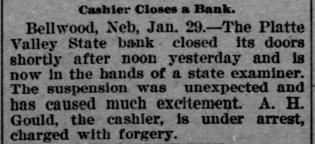 BUSINESS FAILVRES. Jan. 10-Cleveland, O., Euclid Trust & Savings Co.; $1,500,000. 11-Painesville, O., People's bank; $173,000. 14-Chicago, Geo. H. Phillips, "corn king," fails for second time in 7 months. 17-Albany, Ga., Commercial bank; $123,000. 28-Bellwood, Neb., Platte Valley state bank. Feb. 10-Detroit, Mich., City savings bank, on account of shortage of Vice President Frank C. Andrews. 25.-Belmont (O.) national bank. 26-Burnett, Tex., private bank of W. H. Westfall & Co. Mar. 3-Elkhart, Ill., State bank. 15-Wanatah, Ind., Julius Conitz, banker. 20-Americus, Ga., People's bank; $30,000. Apr. 4-St. Paul, U. S. Saving & Loan Co.; $800,000. 24-Algonac (Mich.) Banking Co.'s bank; $32,000. Jun. 3-Chicago, John A. & Alexander Davidson, marble contractors; $1,391,838. 13-Charleston (S. C.) Exposition Co., placed in receivers' hands; $450,000. 30-Murdock, Neb., German state bank; $37,000. Jul. 3-New York city, M. P. Anderson, real estate operator; $1,535,212. 29-Brooklyn, N. Y., Malcolm Brewing Co.; $800,000. Aug. 16-Elgin, III., Obadiah Sands Butter corporation, $445,000. 20-Cleveland, O., Forward Reduction Co., booming Texas oil; $500,000. 24-Elnora (Ind.) bank $10,000. Sep. 2-New York, American bicycle trust. 30-Trenton, N. J., National Salt Co. ("salt trust"); $300,000. Oct. 7-Oto Ia., bank of F. H. Cutting & J. T. Willett: $20,000. 16-New York, Gillman, Son & Co's banking house; $200,000. Nov. 5-Richmond, Va., Leon L. Strause, leaf tobacco; $300,500. 13-Boston, Central national bank. Dec. 8-Omaha, W. H. Bennett Co.'s. department store.
