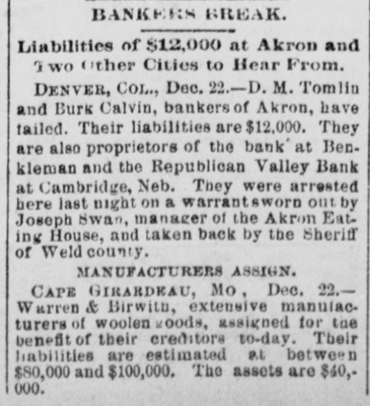 BANKERS BREAK. Liabilities of $12,000 at Akron and I wo Other Cities to Hear From. DENVER, COL., Dec. 22.-D. M. Tomlin and Burk Calvin, bankers of Akron, have tailed. Their liabilities are $12,000. They are also proprietors of the bank at Benkleman and the Republican Valley Bank at Cambridge, Neb. They were arrested here last night on a warrantsword out by Joseph Swan, manager of the Akron Eating House, and taken back by the Sheriff of Weld county. MANUFACTURERS ASSIGN. CAPE GIRARDEAU, Mo, Dec. 22.W arren & Birwith, extensive manulacturers of woolen goods, assigned for the benefit of their creditors to-day. Their liabilities are estimated at between $80,000 and $100,000. The assets are $40,000.