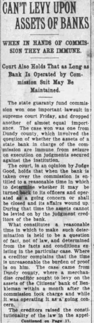The state guaranty fund commission won one important lawsuit in supreme court Friday, and dropped another of almost equal importance. The case was one from Dundy county, which involved the question of whether the assets of state bank in charge of the commission are immune from seizure on execution on judgments secured against the institution. The court, in an opinion by Judge Good, holds that when the bank taken over the titled to reasonable time in which to whether it may be its officers and operated going concern or shall be closed and its affairs wound up During that time the assets cannot be levied on by the judgment creditors of the bank. What constitutes reasonable time in which to make such determination is held to question of fact, not of law. and determined from the facts and conditions existing the particular case. Where creditor complains that the time is unreasonable the burden proof on him. The case came from Dundy county. where merchandise creditor sought to levy on the assets of the Citizens' bank of Benkleman within month after the commission took charge and was operating going concern. The creditors raised the constitutionality of the law in the appel-