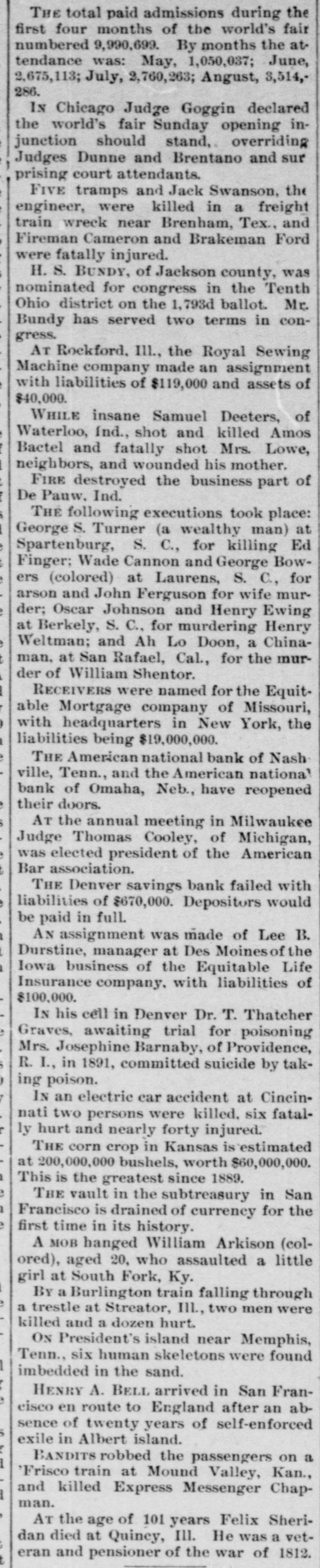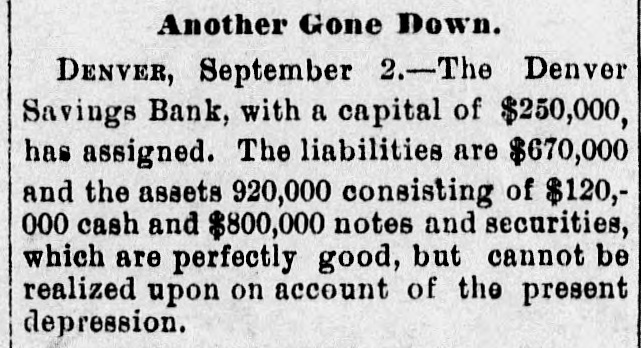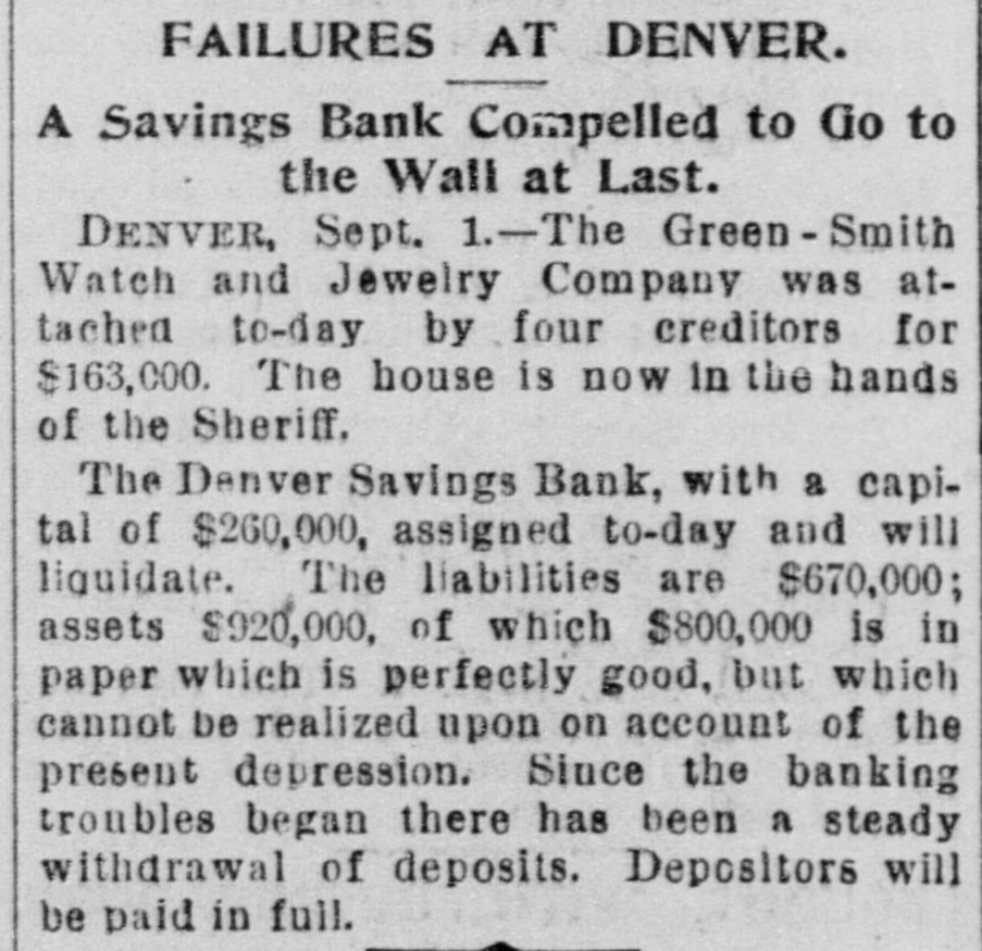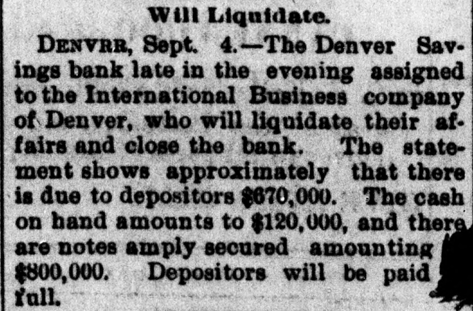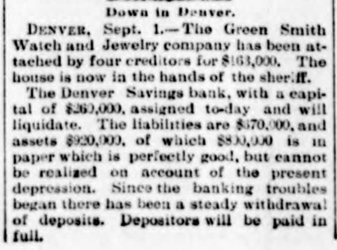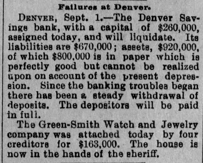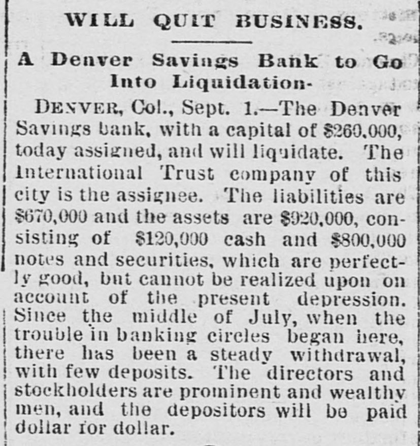 A BANK CRASH IN DENVER. THREE SAVINGS BANKS ARE IN THE HANDS OF ASSIGNEES. They Say Every Depositor will be Paid In Full-It was Impossible In these Days of Distrust to Realize on their SecuritiesOne Bank has Demands for $500,000 Withdrawals and Only 8823 On Hand. DENVER. July 17.-The first bank failures in Denver since 1874 occurred this (morning. when the People's Savings Bank. the Colorado Favings Bank. and the Rocky Mountain Dime and Dollar Savings Banks closed their doors. An estimate of the assets is $1,500,000. with liabilities of $1,350,000. The Colorado Savings Bank. of which F. K. Atkins is President and C.C. Atkins cashier. in its statement to the assignee. Alfred Butters. places the open accounts due depositors at $435,108: certiflcates of deposit. $50,699; due other banks. $3,236: cashier's checks. $625. The assets over liabilities. in what is declared to be good commercial paper. well secured. is $73.063. F. W. Woodbury is President and C. F. Clark cashier of the Rocky Mountain Dime and Dollar Savings Bank. of which Charles H. Blakey was this morning made assignee. A detailed statement has not yet been made, but from the books of the institution it would appear that the assets are $156,803. and the liabilities $105,654. The officers of the institution positively declare that the depositors will not lose a dollar. All the assignments were preconcerted. and were made for self-protection and for the protection of the depositors. The direct cause of the failures was the universal hard times and inability to realize on securities. The President of each bank declares that each depositor will be paid In full and that the institutions will resume again. A run on the Denver Savings Bank is impending. The bank is taking advantage of the thirty and sixty days' notification law and is paying out no amounts over $25. President Lawrence of the People's Savings Bank. in a statement this morning said the savings bank. up to six weeks ago. had had a most successful career. having in deposits $1,300,000 and had paid to its depositors in interest $112,482. The causeless run begun on May 1 had really continued up to last Saturday night, when the entire available means of the bank were exhausted and nothing was left but to assign. The officers of the Institution pledged their estates to its support. but because of the feeling that has been engendered among Eastern banks and financial Institutions by the recently published expressions and demonstrations that have been heralded from Colorado, a thirty days' notice for $100,000. signed by Colorado parties worth $4,000,000, to raise immediate money. was not worth the paper it was written on. Most persistent efforts were made to obtain temporary assistance to tide the bank over. Up to four days ago this necessary assistance was promised by Eastern correspondent banks: but since the doings of the recent Convention in this city became known all over the country these promises were cancelled by telegraph. and no alternative was left us. With notices amounting to nearly $500.000 for withdrawals of deposits maturing within the near future staring us in the face. and the cash on hand paid down to $223. the best thing to do was to make a full assignment for the protection and benefit of all." The President further said: The failure of the savings banks will in no way affect the People's National Bank. which, with all other national banks. are perfectly sound. and anticipate no trouble outside of the savings banks.