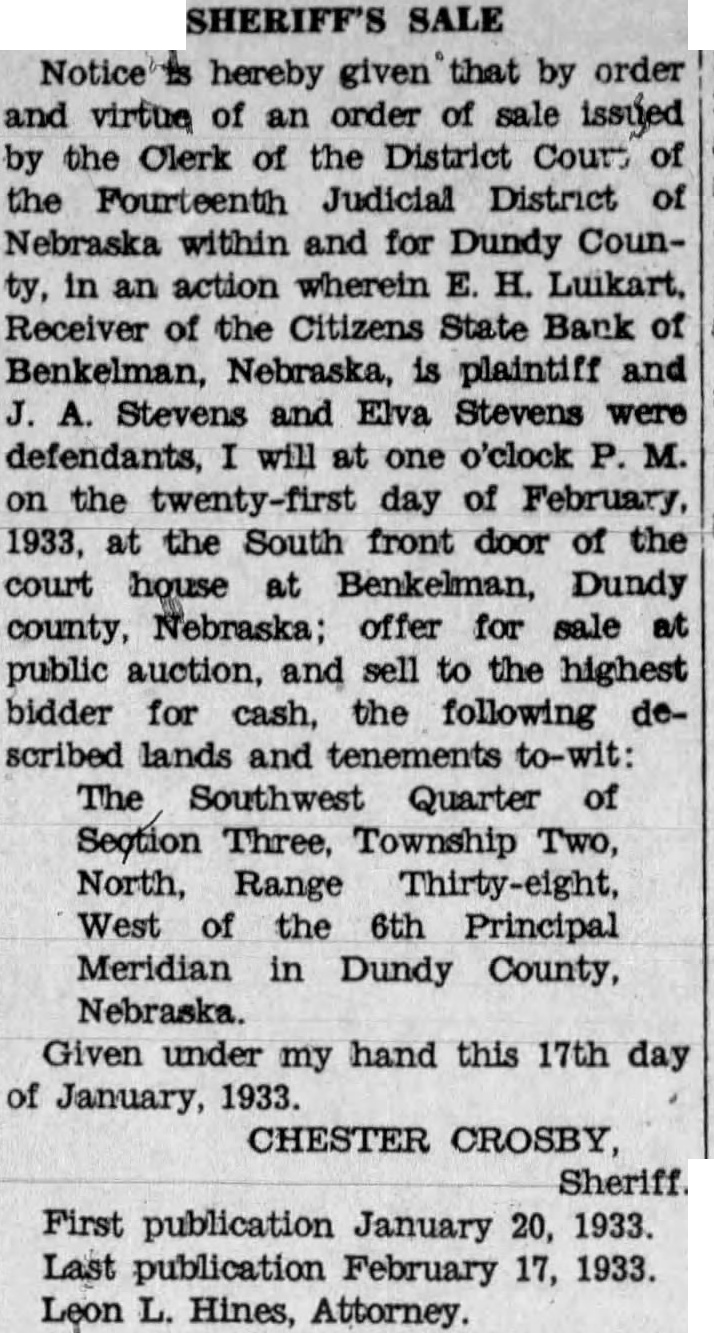 SHERIFF'S SALE Notice hereby given that by order and virtue of an order of sale issued by the Clerk of the District Court of the Fourteenth Judicial District of Nebraska within and for Dundy County, in an action wherein E. H. Luikart. Receiver of the Citizens State Bank of Benkelman, Nebraska, is plaintiff and J. A. Stevens and Elva Stevens were defendants, I will at one o'clock P. M. on the twenty-first day of February, 1933, at the South front door of the court house at Benkelman, Dundy county, Nebraska; offer for sale at public auction, and sell to the highest bidder for cash, the following described lands and tenements to-wit: The Southwest Quarter of Section Three, Township Two, North, Range Thirty-eight, West of the 6th Principal Meridian in Dundy County, Nebraska. Given under my hand this 17th day of January, 1933. CHESTER CROSBY, Sheriff. First publication January 20, 1933. Last publication February 17, 1933. Leon L. Hines, Attorney.