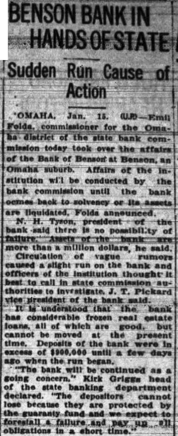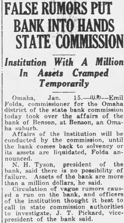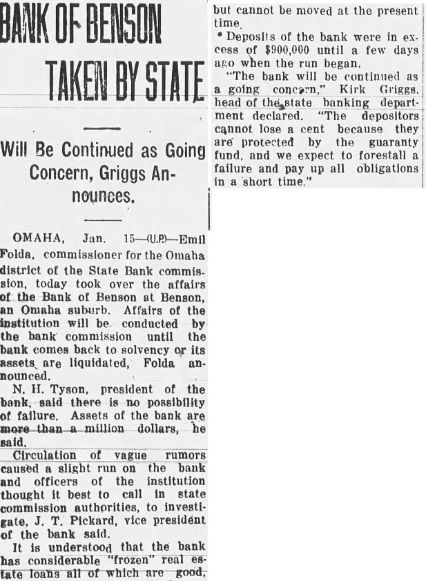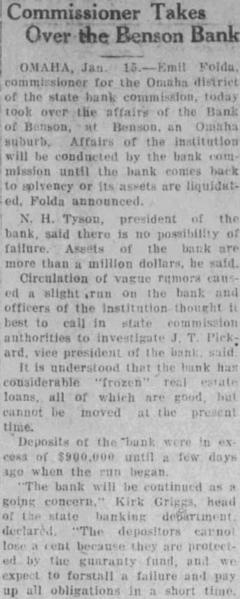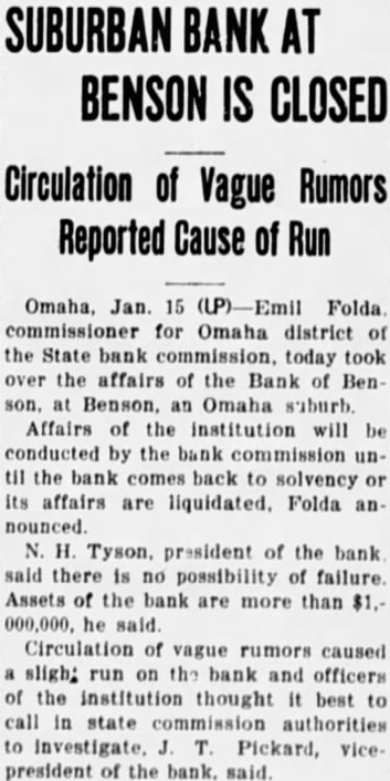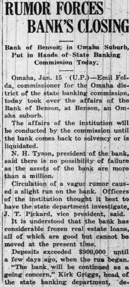 SUBURBAN BANK AT BENSON IS CLOSED Circulation of Vague Rumors Reported Cause of Run Omaha, Jan. 15 Folda commissioner for Omaha district of the State bank commission, today took over the affairs of the Bank of Benson. at Benson, an Omaha suburb. Affairs of the institution will be conducted by the bank commission until the bank comes back to solvency or its affairs are liquidated, Folda an nounced. N. H. Tyson. president of the bank said there is no possibility of failure. Assets of the bank are more than $1. 000,000, he said. Circulation of vague rumors caused sligh: run on the bank and officers of the institution thought it best to call in state commission authorities to investigate. J. T. Pickard, vice. president of the bank. said.