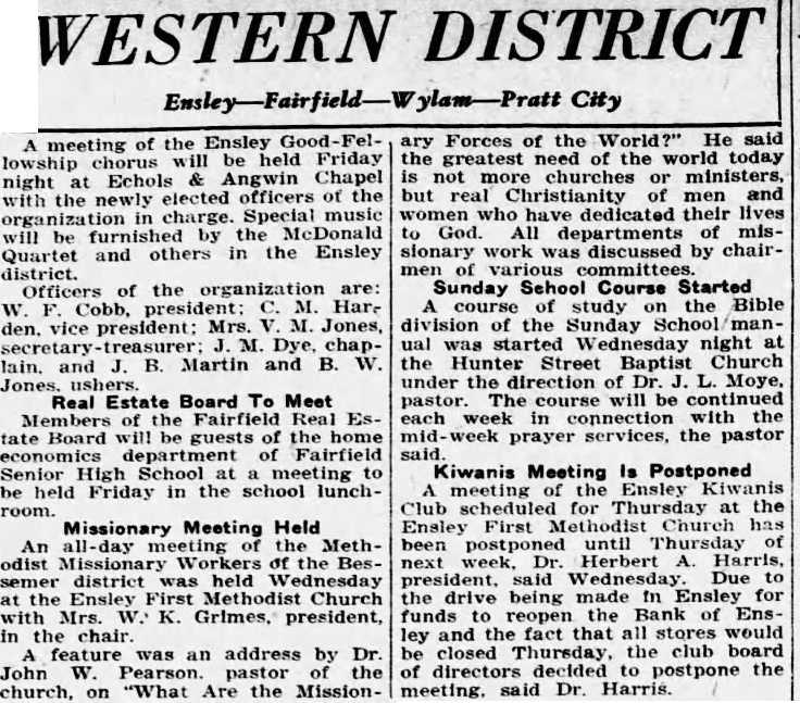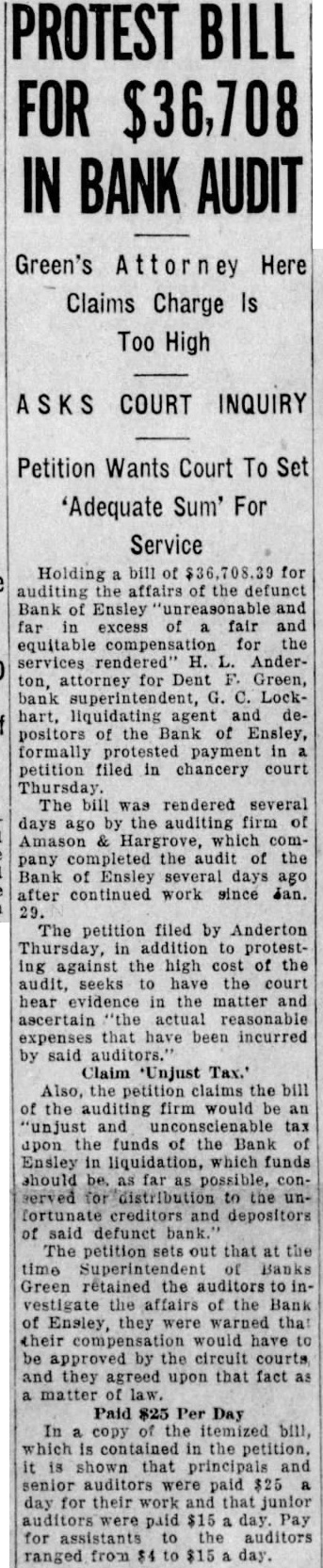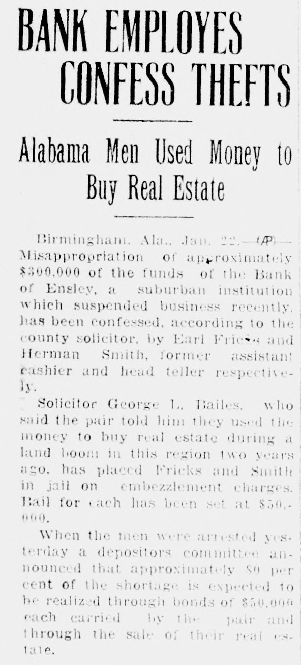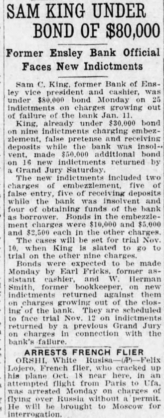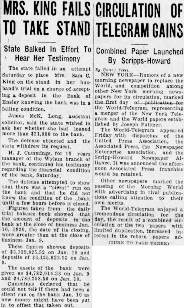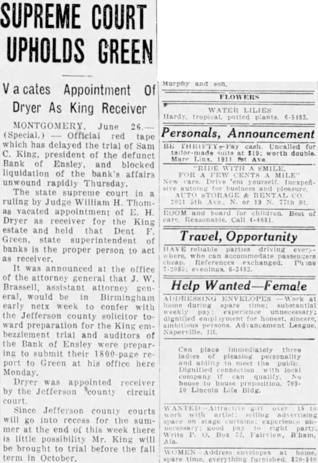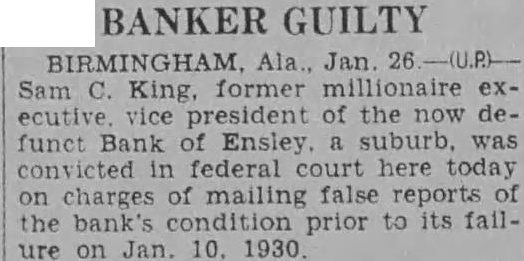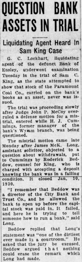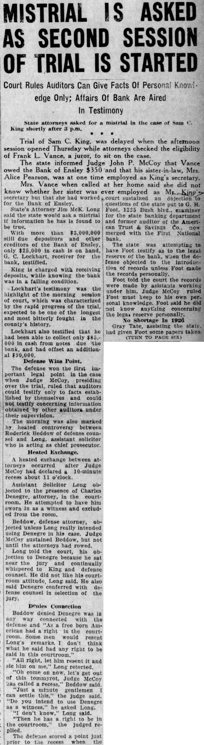 Trial of Sam C. King, was delayed when the afternoon session opened Thursday while attorneys checked the eligibility of Frank Vance, juror, to sit on the case. The state informed Judge John McCoy that Vance owed the Bank of Ensley $350 and that his Mrs. Alice Pearson, was at one time employed King secretary. Mrs. Vance when called at her home said she did not know whether her sister was ever employed as secretary had worked objection the Bank Ensley. questions of the state to put State's Attorney Jim Long Foot. 1225 Bush blvd., examiner the state would mistrial for the state banking department information he has found former auditor the AmeriTrust Savings With more than merged with the First National still due depositors and other creditors of the Bank of Ensley The state was attempting to in cash hand, have Foot testify to the legal Lockhart, receiver for the reserve the bank, when the bank, testified. fense objected the introduction of records unless Foot made King is charged with receiving the records deposits, while knowing the bank Foot told the court the records failing condition were made asistants working Lockhart's testimony was the under him. Judge McCoy ruled highlight the morning session Foot must keep his own of court, which was sonal knowledge. Foot said he the rapid of the trial, not know anything concerning expected to one of the longest the lega, reserve personally. and most bitterly fought in the Shortage In 1926 county's history. Gray Tate, assisting the state, Lockhart also testified that he had Foot some taken been able collect only (TURN PAGE