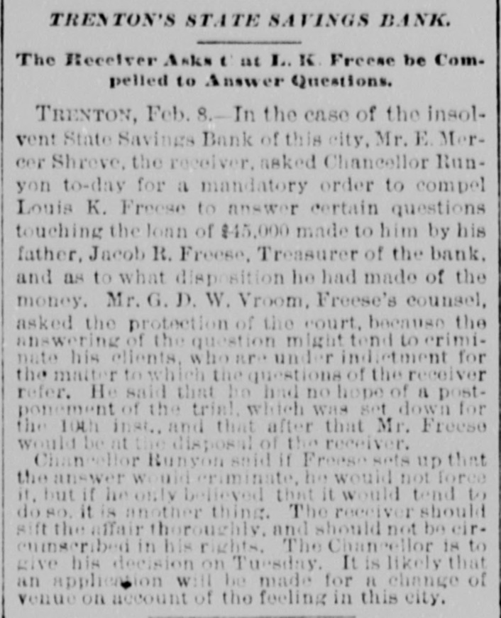 JERSEY SAVINGS BANKS. There continues in Newark among the many thousands of depositora in the Newark Savings Institution a deep seated feeling of distrust and even anger toward the management under whose control the bank was obliged to suspend last month, and a vigorous effort 19 being made by some of the depositors to not only bring about a complete change of management, but to have the responsible officers overbauled by the Grand Jury. Yesterday afternoon a number of German depositors held a meeting at Turn Hall, in Newark, when the subject was discussed with considerable freedom and anima110n in the German language The Agitation Committée made a report setting forth that they bad secured the services of Counsellors Teese and Fitzpatrick, and had been advised by them to apply to the Chancellor lor the removal of the present Board of Directors of the bank. Mr. Daniel Dodd, president of the bank, had stated, in answer to a communication calling upon him to resign, that he and the twelve directors, all except one, were ready to resign or would appoint such men in their places as the depositors might name, and then the new direc. tors could fill all vacancies. Ex-Assemblyman Gottfried Kornegar expressed himself in favor of keeping the present directors ID office until their management had been investigated by the Grand Jury. He was informed, however, that their removal would in no wise alter their status be. lore the Grand Jury. With the understanding that the list was to be submitted to the American depositors for approval or addition, should they hold a meeting, the following names were presented by the Agitation Committee and adopted as the choice of the meeting for new directors:-Jose Hensier, Noah Blanchard, Herman Schalk, M. R Dennis, Mayor Henry J. Yates, David M. Meeker, Theodore Macknit, Julius Brose, James G. Barnett, Horace Alling, George H. Wilkinson. EN H. Reynolds, Charles Borcherling, Alexander Nichola, Isador Lehinau, Julius Staff, Joseph Feder, Fred. erick Reinhold and Cuarles Neumann. A resolution Scat by Rev. Oscar Kroit, who was un. able to attend, opposing the supplement to the Geaera! Savings Bank act, now before the Legislature, was referred to the counsel above named. It IS understood that the matter will be brought to-day before the Grand Jury, with a view to getting that body to probe the past management of the bank to the bottom. STATE SAVINGS BANK. Great excitement prevails respecting the State Savings Bank of Trenton, of which J. R. Freese is VICO president; H. C. Freeae, hisson, cashier, with another son in the office. It was the relatives of this same Freese family who ran the Jersey City Savings Bank until Secretary of State Kelsey assumed charge. That flurry occasioned such distrust tespecting the "Freese bank" that a number of depositors gave the required two weeks' notice, which ex pired yesterday. W. H. Skeria, acting for Patrick Kelly, applied yesterday for the return of $540, but was refused by the cashier, who referred hith to J. R. Freese, then sitting in the rear office. This official stated that the demand, although in legal form, could not be met; that the assets of the bank were being scheduled for the purpose of securing a loan; that be had $100,000 in roal estate, all of which would be put up it necessary in order to protect the depositors, and until the loan could be effected nothing would be done. He was confident. however, that in the course of two or three days everything would be in shape. The Court of Chancery last night served an injunction on the treasurer of the bank restraining it from transacting any more business. It IS believed that a receiver' will be appointed to-morrow. Colonel Jacob R Freese, treasurer of the bank, places the habilities at $65,000 and the assets about $57,000. He stated that the run on the bank commenced two weeks ago, when 16 was found necessary to give the customary two weeks' notice to depositors. That expired last Saturday and the run was then 1m. mense, so much so that there was no money to pay out. The Colonel says he tried to negotiate several loans, one for $25,000, giving as security his personal property, worth $100,000, but failed., He says the securities are nearly all mortgages. He 18 willing to take the entire responsibility, and will see that no depositor loses a dollar. He says he pledges his word and honor to that effect. Mr. Freese is director of the First National Bank of Trenton, and holds other positions of honor. He 18 said to DO wealthy. THE DIME SAVINGS BANK. Mr. A. B. Dayton, of Jersey City, has presented to Chancellor Runyon, of New Jersey, at his chambers, in Newark, a potition of the Dime Savings Bank, of Hudson City, for direction in administering the trust, &c. The petition 8018 forth that there 18 now due de positors the sum of $27,246 06, and that the invest. ments of the institution are as follows:In bonds and mortgages on lands in Hudson county to the amount of $20,980. and in Bergen county $1,800;on lands in Jersey City $2,400, in the sales and office furniture of the institution 1,400, and $2,830 due from the estate of the late treasurer of the institution, and also in cash $100. It was represented