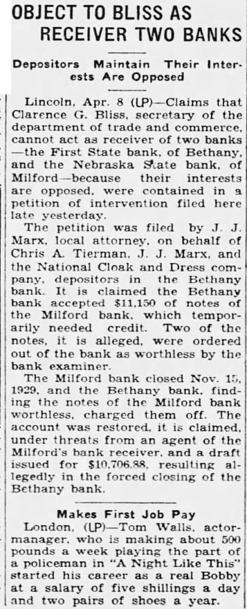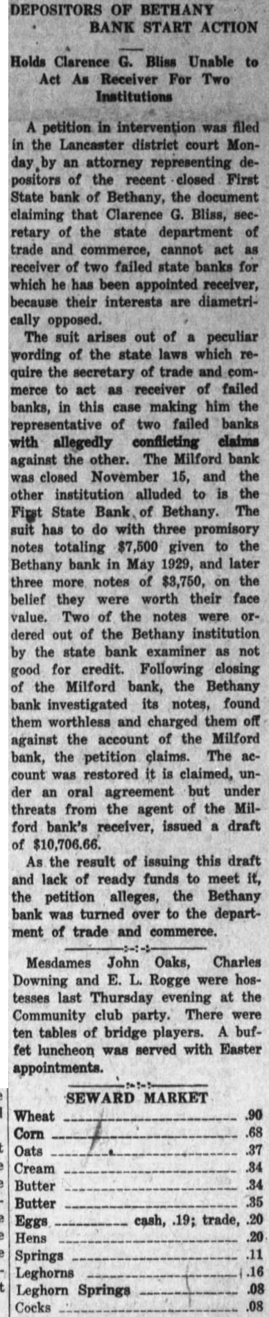SAYS BLISS CAN'T BE BANKS' RECEIVER Intervenors Allege Claims of First State and the Milford Bank Are in Conflict. petition intervention was filed district court Monday afternoon by Marx, local torney, on behalf Chris Tiernan, Marx and the National Cloak Dress company, depositors in the First State Bethany, which is claimed that Clarence Bliss, secretary the department of trade and cannot act receiver two state banks because their interests diametrically opposed. Secretary Bliss is receiver the First State of Bethany and the Nebraska State Bank Milford. claimed that in May, 1929, M. Koenig, as cashier of the Milford bank, for purpose obtaining some temporary credit for the Milford bank, to the First State Bank of Bethany three notes It claimed that the in good ficondition. alleged that these notes were to face value when known the Milford bank to be without value. claimed that the First State bank of Bethany later accepted three notes to the amount of them worth face value but that Koenig knew them to valueless. Two of the notes were ordered out state bank, is claimed, by bank examiner. The Milford bank closed Nov. 15, 1929, and the First State bank investigated its notes and found and charged them off against Milford bank, said with an agreement with Koenig. The account was restored under threats from an agent the Milford bank's receiver, and draft issued for $10,706.66. result of the issuing of this draft, claimed, and lack of ready funds to meet First State bank was turned the state department. The Milford bank filed preferred against the local institution for the amount and intervenors ask that the amount the notes with be set off in favor of the First State bank of Bethany and that the draft be cancelled and the Bethany bank be given ment for any excess.