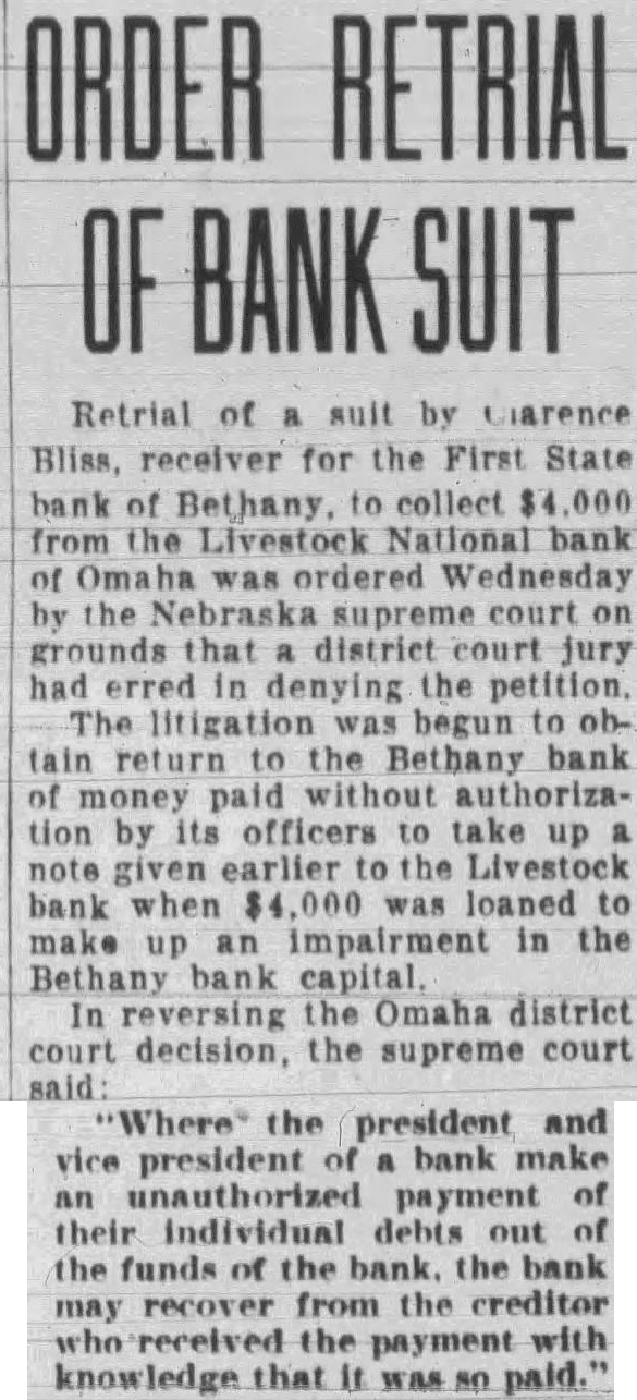 ORDER Retrial of suit by charence Bliss, receiver for the First State bank of Bethany. collect from the Livestock National bank was ordered Wednesday by the Nebraska supreme court on grounds that district court jury had erred denying the petition. The litigation was begun to obtain return to the Bethany bank of money paid without authorization by its officers to take up note given earlier the Livestock bank when was loaned to make up an impairment in the Bethany bank the Omaha district court decision, the supreme court said: 'Where' the president and vice president bank make unauthorized payment their individual debts out the funds of the bank. the bank may recover from the creditor received the payment with knowledge that NO