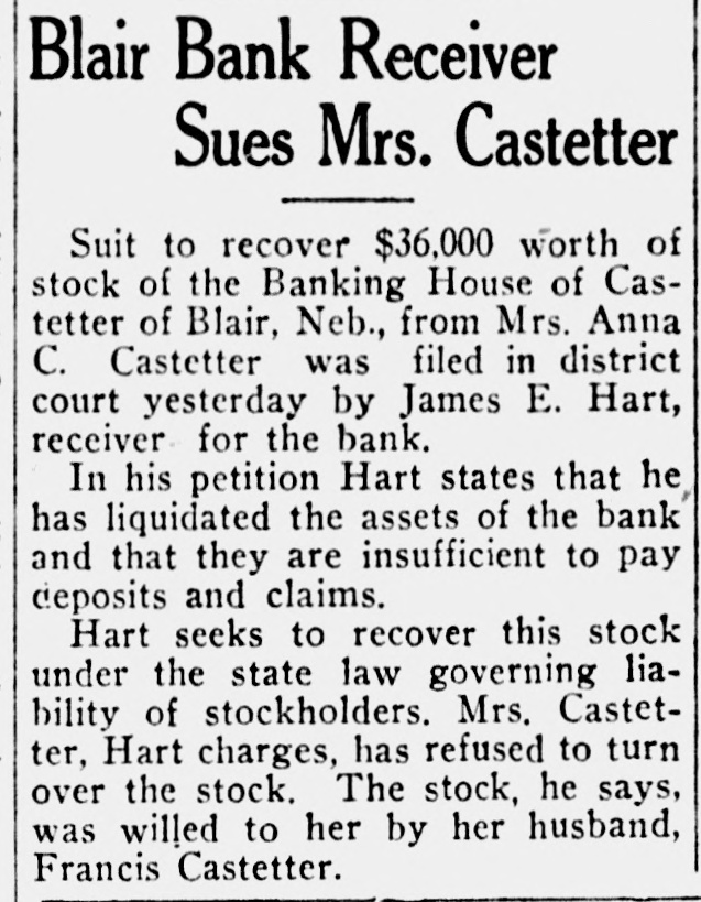 Blair Bank Receiver Sues Mrs. Castetter Suit to recover $36,000 worth of stock of the Banking House of Castetter of Blair, Neb., from Mrs. Anna C. Castetter was filed in district court yesterday by James E. Hart, receiver for the bank. In his petition Hart states that he has liquidated the assets of the bank and that they are insufficient to pay deposits and claims. Hart seeks to recover this stock under the state law governing liability of stockholders. Mrs. Castetter, Hart charges, has refused to turn over the stock. The stock, he says, was willed to her by her husband, Francis Castetter.