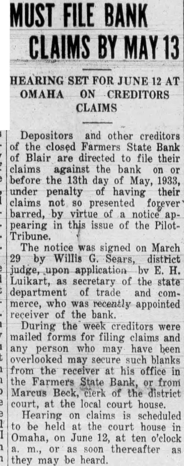 BANK SUSPENSIONS Bank of Union was closed January 12, 1933 by its officers and directors and turned over to the Dept. of Trade and Commerce. Officers are W. B. Bannig, Vice-president and D. Ray Frans, Cashier. Capital stock $15,000 and deposits about $70,000. Farmers State Bank, Ogallala, was closed January 6, 1933 by its officers and directors and turned over to the Dept. of Trade and Commerce. Capital stock is $35,000 and deposits about Officers are: President, E. A. Smith, Vice-president C. R. Smith and Cashier, John M. Creamer. Greenwood State Bank on action of its officers and directors suspended business January 9 for reorganization. Capital stock is $25,000; surplus $5,000. Officers are P. L. Hall, President; E. A. Landon, Vice-president; E. O. Miller, Cashier. Examiner J. F. McLain is on charge for the dept. of trade and commerce. Farmers State Bank of Blair suspended operations December 31, 1932 pending reorganization. Peter M. Tyson is president, C. M. Hitchman vice president and R. C. Hitchman cashier. Bank's capital is $35,000 and its surplus $15,000. Examiner J. F. McLain is in charge for the state dept. of trade and commerce.