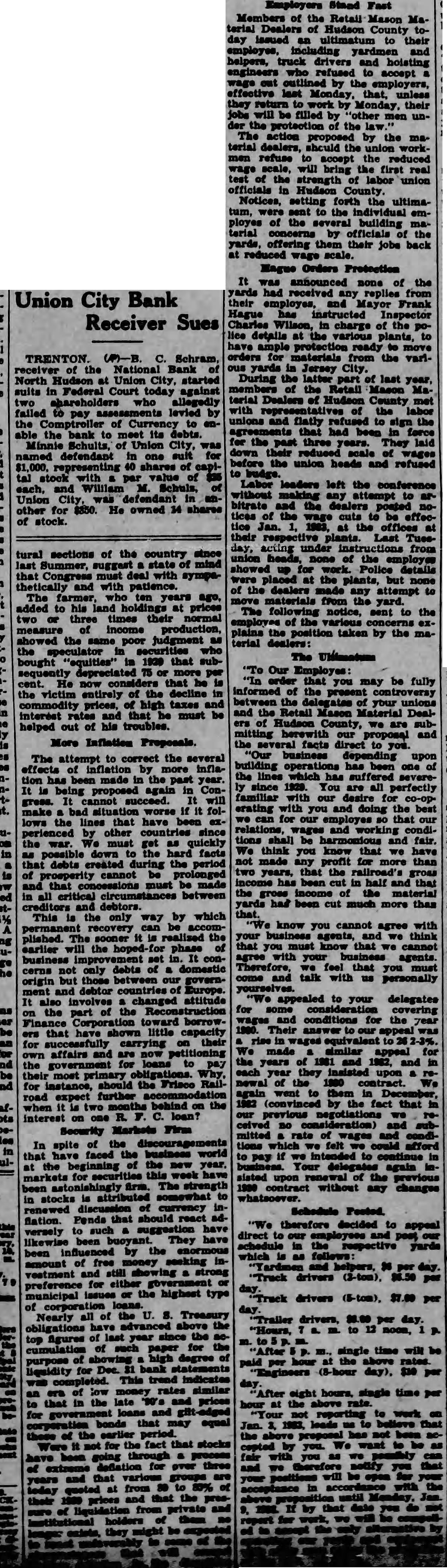 Employers Stand Fast Members of the Retail Mason Material Dealers of Hudson County today issued ultimatum to their and helpers, truck drivers and hoisting engineers to accept wage by employers, last Monday, unless by their jobs will be filled "other men unthe the The action proposed by the terial dealers, should the workmen refuse accept the reduced scale, will bring the first real test of the strength of labor union officials Hudson County. Notices, setting forth ultimatum, the individual employes of the building maby yards, offering their jobs back at wage Mague Orders It announced none of the had received any replies their Frank Hague Charles charge of the police details at the various have protection ready to orders for materials from the various yards in Jersey City. During the latter part of last year, members the Retail Mason terial Dealers of Hudson County met representatives the labor unions flatly refused sign the had been in for the past three They down of wages before union heads and refused to budge. Labor leaders left the conference without making attempt to bitrate dealers of the cuts to be effectice Jan. the offices their respective plants. Last Tuesacting under from union none of the employee up for Police details at the but none of the dealers to from yard. The notice, sent to the of explains the taken by the terial dealers: