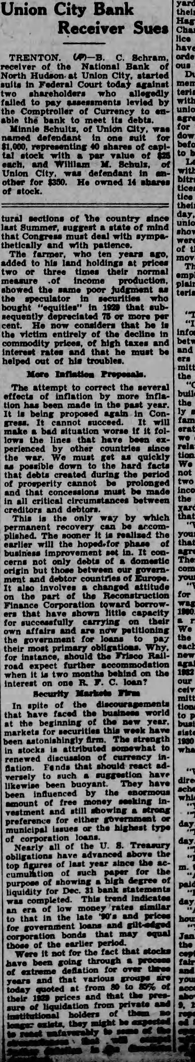 Union City Bank Receiver Sues of the National Bank North at Union City, started suits in Federal Court today against allegedly failed to pay levied by the Comptroller of Currency to enthe bank to meet its debts. Minnie Schults, of Union City, named defendant one for shares of tal stock with par value of each, and William M. Union other for He owned 14 shares of stock. tural sections of the country last Summer, suggest state that with thetically and with patience. farmer, ten years ago, added to his land holdings at prices two three times their normal measure production, showed the same poor judgment the speculator who bought "equities" that He now that he the victim entirely of the decline prices, of high taxes interest and that must be helped of his