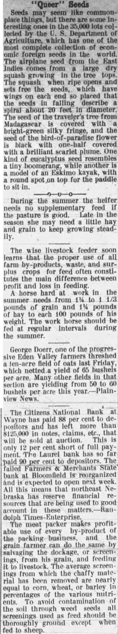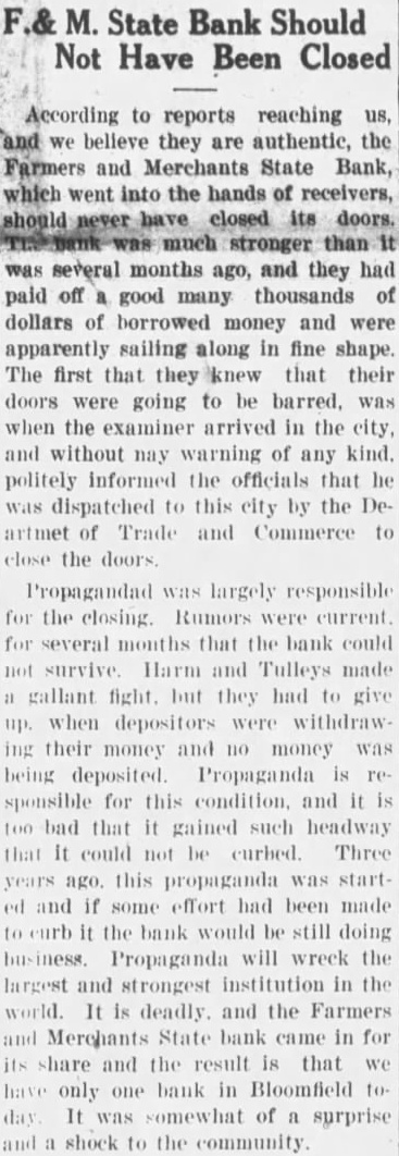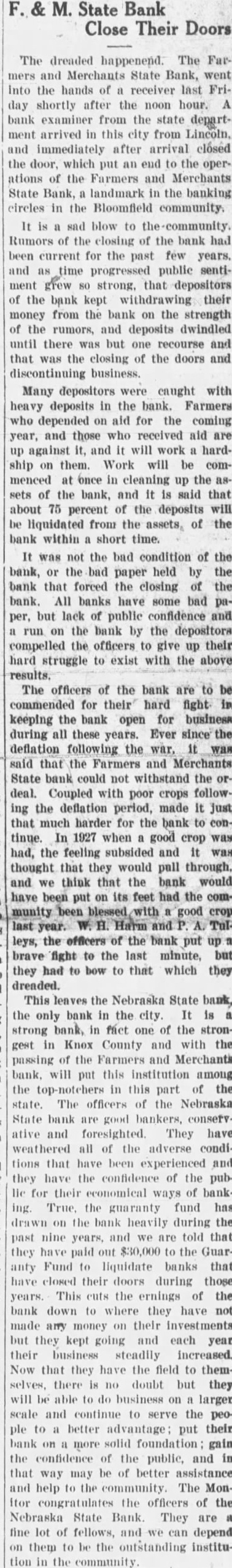 The dreaded happenend. The and Merchants State Bank, went into the hands of receiver last day shortly after the noon hour. bank examiner from the state ment arrived in this from Lincoln, and immediately after arrival closed the door, which put an end to the ations of the Farmers and Merchants State Bank, landmark the banking circles in the Bloomfield community. sad blow to Rumors the closing of the bank had been current for the past few years. and time progressed public sentiment grew that depositors the bank kept withdrawing their money from the bank the strength the rumors, and deposits dwindled until there was but recourse and that was the closing of the doors and discontinuing business. Many caught with deposits in the bank. Farmers depended aid for the coming year, and those received aid are up against and will work hardship on them. Work commenced at once in cleaning up the of the bank, and said that about 75 percent of the deposits will liquidated from the assets, of the bank within short time. not the bad condition of the bank, the bad paper held the bank that forced the closing of the bank. All banks have some bad per, but lack of public confidence the bank by the depositors compelled the officers to give up their hard struggle to exist with the above results. The officers of the bank commended for their hard fight keeping the bank open for business during all these years. Ever since the deflation following the said that the Farmers and Merchants State bank could not withstand the deal. Coupled with poor crops following the deflation period, made that much harder for the bank to continue. In 1927 when good crop was had, the feeling subsided and was thought that they would pull through. and think that the bank would have been put on its feet had the combeen Harm the officers the bank put brave fight the last minute, but they had to bow to that which they dreaded. This leaves the Nebraska State bank, the only bank in the city. bank, fact one of the strongest in Knox County and with the passing of the Farmers and Merchants bank. will put this institution among the top-notchers in this part the The officers the Nebraska State bank good bankers, conservand They have weathered all the adverse condithat have been experienced and they have the confidence of the pubtheir ways banking. True, guaranty fund has the bank heavily during the past years, and told that the GuarFund liquidate banks that closed their doors during those This the ernings the bank down where they not made their they kept going and each year their business steadily increased. Now that they have the field to themthere doubt but they business larger and continue the peobetter put their bank more solid foundation: gain the confidence the public, and in that way may be of better and help the community. The Monftor congratulates the officers of the Nebraska State They are fine of fellows, and can depend them the outstanding institution in the community