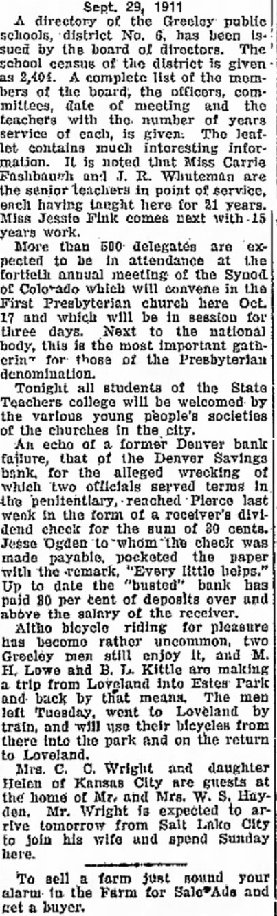 Sept. 29, 1911 A directory of the Greeley public schools, district No. 6, has been is. sued by the board of directors. The school census of the district is given as 2,404. A complete list of the mombers of the board, the officers, committees, date of meeting and the teachers with the number of years service of each, is given. The leaflet contains much interesting information. IL is noted that Miss Carrie Fashbaugh and J. R. Whuteman are the senior teachers in point of service, each having taught here for 21 years. Miss Jessie Fink comes next with 15 years work. More than 500 delegates are expected to be in attendance at the fortteth annual meeting of the Synod of Colorado which will convene in the First Presbyterian church here Oct. 17 and which will be in session for three days. Next to the national body, this is the most important gatherin" for those of the Presbyterian denomination. Tonight students of the State Teachers college will be welcomed by the various young people's societies of the churches In the city. An echo of a former Denver bank failure, that of the Denver Savings bank. for the alleged wrecking of which two officials served terms In the penitentlary, reached Plerce last week in the form of a receiver's dividend check for the sum of 30 cents. Jesse Ogden to "whom check was made payable, pocketed the paper with the remark, "Every [ittle helps." Up to date the "busted" bank has paid 80 per cent of deposits over and above the salary of the receiver. Altho bicycle riding for pleasure has become rather uncommon, two Greeley men still enjoy It, and M. H. Lowe and B. L. Kittle are making a trip from Loveland into Estes Park and back by that means. The men left Tuesday. went to Loveland by train, and will use their bicycles from there into the park and on the return to Loveland. Mrs. C. C. Wright and daughter Helen of Kansas City are guests at the home of Mr. and Mrs. W. S. Hayden. Mr. Wright is expected to arrive tomorrow from Salt Lake City to join his wife and spend Sunday here. To sell a farm just sound your alarm in the Farm for Sale*Ade and get buyer.