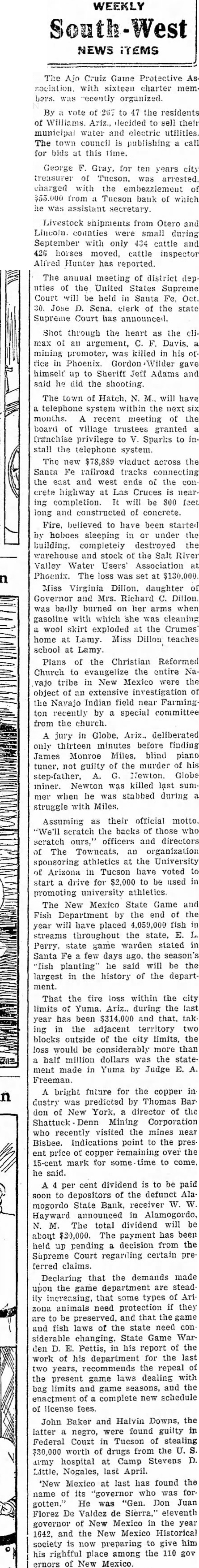 WEEKLY South-West NEWS ITEMS The Ajo Cruiz Game Protective Association. with sixteen charter members. was recently organized By a vote of 257 to 47 the residents of Williams Ariz., decided to sell their municipal water and electric utilities. The town council is publishing a call for bids at this time. George F. Gray, for ten years city treasurer of Tucson. was arrested charged with the embezzlement of $55.000 from a Tucson bank of which he was assistant secretary. Livestock shipments from Otero and Lincoin. counties were small during September with only 404 cattle and 426 horses moved, cattle inspector Alfred Hunter has reported. The annual meeting of district deputies of the United States Supreme Court will be held in Santa Fe, Oct. 30. Jose D. Sena, clerk of the state Supreme Court has announced. Shot through the heart as the climax of an argument, C. F. Davis. a mining promoter, was killed in his of tice in Phoenix Gordon Wilder gave himself up to Sheriff Jeff Adams and said he did the shooting. The town of Hatch. N. M. will have a telephone system within the next six months. A recent meeting of the board of village trustees granted a franchise privilege to V. Sparks to install the telephone system. The new $78,889 viaduct across the Santa Fe railroad tracks connecting the east and west ends of the COM crete highway at Las Cruces is nearing completion. It will be 800 feet long and constructed of concrete. Fire. believed to have been started by hoboes sleeping in or under the building. completely destroyed the warehouse and stock of the Salt River Valley Water Users' Association at Phoenix. The loss was set at $130,000. Miss Virginia Dillon. daughter of Governor and Mrs. Richard C. Dillon. was badly burned on her arms when gasoline with which she was cleaning a wool skirt exploded at the Crumes home at Lamy. Miss Dillon teaches school at Lamy. Plans of the Christian Reformed Church to evangelize the entire Na. vajo tribe in New Mexico were the object of an extensive investigation of the Navajo Indian field near Farming ton recently by a special committee from the church. A jury in Globe. Ariz.. deliberated only thirteen minutes before finding James Monroe Miles. blind piano tuner. not guilty of the murder of his step-father, A. G. Newton Globe miner. Newton was killed last summer when he was stabbed during a struggle with Miles. Assuming as their official motto "We'll scratch the backs of those who scratch ours," officers and directors of The Towncats, an organization sponsoring athletics at the University of Arizona in Tucson have voted to start a drive for $2,000 to be used in promoting university athletics The New Mexico State Game and Fish Department by the end of the year will have placed 4,059,000 fish in streams throughout the state, E. L. Perry. state game warden stated in Santa Fe a few days ago. the season's "Tish planting" he said will be the largest in the history of the department. That the fire loss within the city limits of Yuma. Ariz.. during the last year has been $314,000 and that, tak ing in the adjacent territory two blocks outside of the city limits, the loss would be considerably more than a half million dollars was the statement made in Yuma by Judge E. A. Freeman A bright future for the copper in dustry was predicted by Thomas Bardon of New York, a director of the Shattuck Denn Mining Corporation who recently visited the mines near Bisbee. Indications point to the present price of copper remaining over the 15-cent mark for some-time to come. he said. A 4 per cent dividend is to be paid soon to depositors of the defunct Alamogordo State Bank, receiver W. W. Hayward announced in Alamogordo, N. M. The total dividend will be about $20,000. The payment has been held up pending a decision from the Supreme Court regarding certain preferred claims. Declaring that the demands made upon the game department are steadily increasing, that some types of Ari zona animals need protection if they are to be preserved, and that the game and fish laws of the state need considerable changing. State Game Warden D. E. Pettis, in his report of the work of his department for the last two years, recommends the repeal of the present game laws dealing with bag limits and game seasons, and the enactment of a complete new schedule of license fees. John Baker and Halvin Downs, the latter a negro, were found guilty in Federal Court in Tucson of stealing $30,000 worth of drugs from the U. S. army hospital at Camp Stevens D. Little, Nogales, last April. "New Mexico at last has found the name of its "governor who was forgotten. He was "Gen. Don Juan Florez De Valdez de Sierra,' eleventh governor of New Mexico in the year 1642, and the New Mexico Historical society is now preparing to give him his rightful place among the 110 gov ernors of New Mexico.