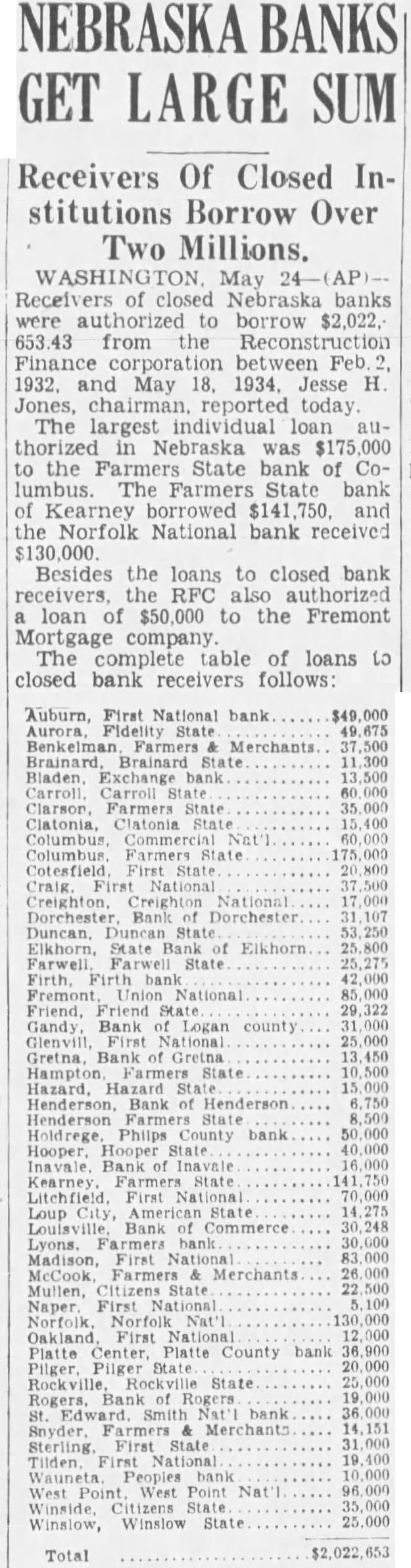 NEBRASKA BANKS GET LARGE SUM Receivers Of Closed Institutions Borrow Over Two Millions, WASHINGTON May 24-(AP)Receivers of closed Nebraska banks authorized to borrow $2,022. from the Reconstruction Finance between 1932. and May 18, 1934 Jesse H Jones, reported today The largest individual Nebraska was $175,000 the State bank of Farmers State bank Kearney borrowed Norfolk National bank received $130,000 Besides the loans to closed bank loan of $50,000 to the Fremont company The complete table of loans to closed bank receivers follows: Auburn First National bank Brainard Dorchester Elkhorn county Bank Farmers bank Commerce Merchants Center County State Smith Point Total $2,022,653