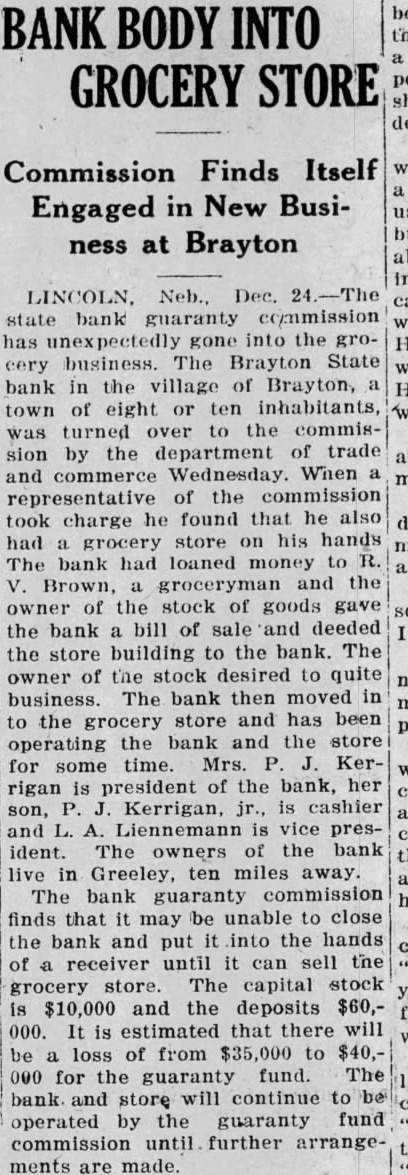 BANK BODY INTO GROCERY STORE Commission Finds Itself Engaged in New Business at Brayton LINCOLN, Neb., Dec. 24.-The state bank guaranty commission has unexpectedly gone into the grocery business. The Brayton State bank in the village of Brayton, a town of eight or ten inhabitants, was turned over to the commission by the department of trade and commerce Wednesday. When a representative of the commission took charge he found that he also had a grocery store on his hands The bank had loaned money to R. V. Brown, a groceryman and the owner of the stock of goods gave the bank a bill of sale and deeded the store building to the bank. The owner of the stock desired to quite business. The bank then moved in to the grocery store and has been operating the bank and the store for some time. Mrs. P. J. Kerrigan is president of the bank, her son, P. J. Kerrigan, jr., is cashier and L. A. Liennemann is vice president. The owners of the bank live in Greeley, ten miles away. The bank guaranty commission finds that it may be unable to close the bank and put it into the hands of a receiver until it can sell the grocery store. The capital stock is $10,000 and the deposits $60,000. It is estimated that there will be a loss of from $35,000 to $40,000 for the guaranty fund. The bank and store will continue to be operated by the guaranty fund commission until further arrangements are made.