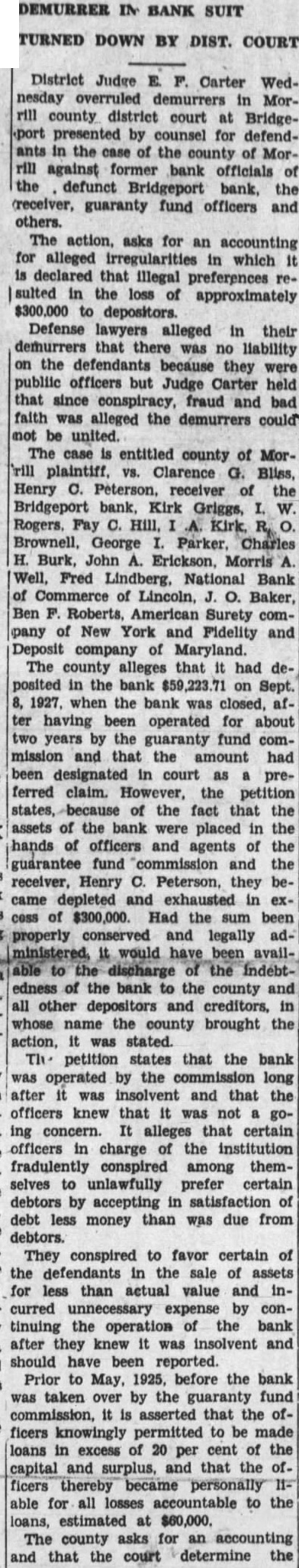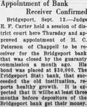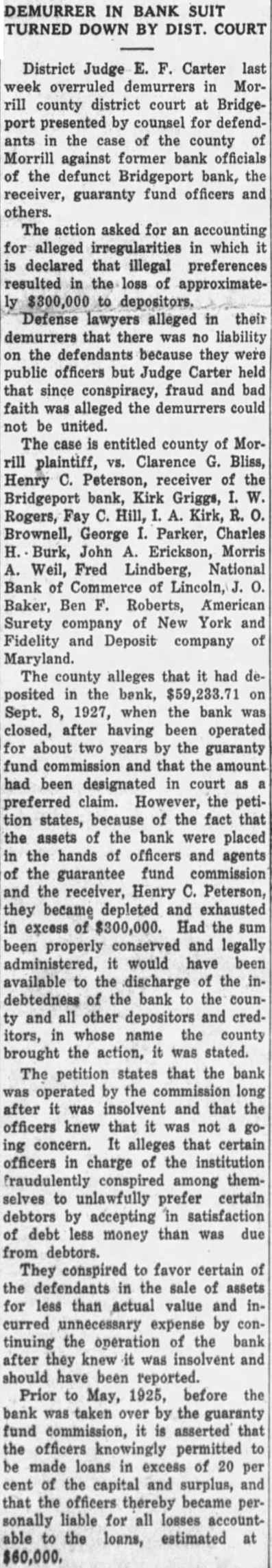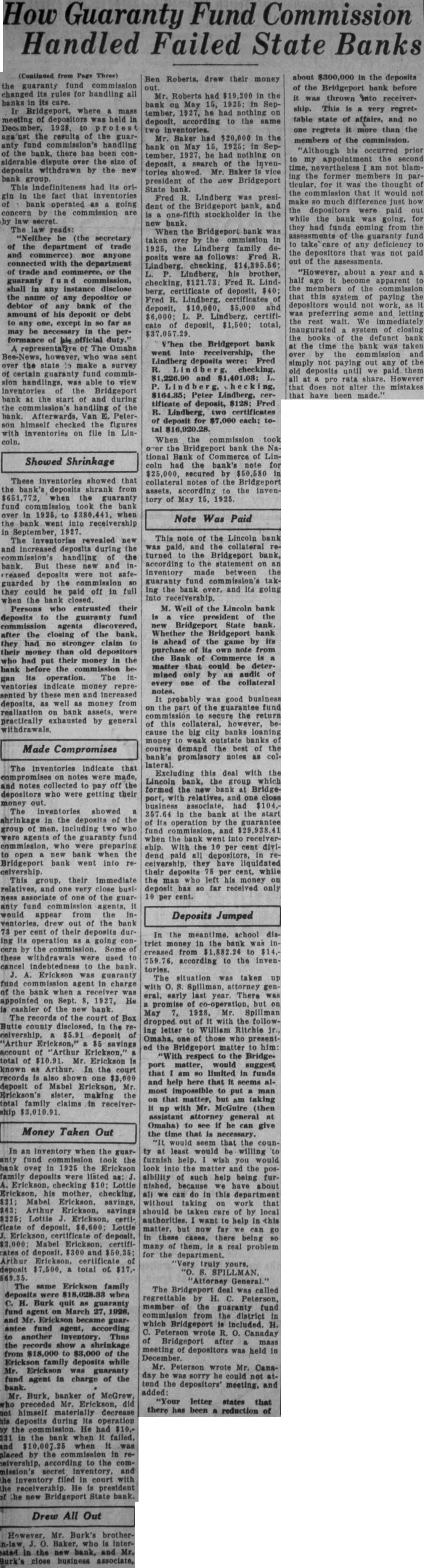 In the meantime. school district money in the bank was increased from $1,882 to $14,759.76, according to the inventories. The situation was taken up with o. S. Spillman, attorney general. early last year. There was promise of co-operation, but on May 7. 1928, Mr. Spillman dropped. out of It with the following letter to William Ritchie jr., Omaha, one of those who presented the Bridgeport matter to him: "With respect to the Bridgeport matter, would suggest that am so limited in funds and help here that It. seems almost impossible to put man on that matter, but am taking If up with Mr. McGuire (then assistant attorney general at Omaha) to see If he can give the time that is necessary. "It would seem that the county at least would be willing to furnish help. wish you would look into the matter and the possibility of such help being furnished, because we have about all we can do in this department without taking on work that should be taken care of by local authorities. want to help in this matter. but now far we can go in these cases, there being so many of them, is a real problem for the department. 'Very truly yours. 'Attorney General.' The Bridgeport deal was called regrettable by H. C. Peterson, member of the guaranty fund commission from the district in which Bridgeport is included. H. C. Peterson wrote R. O. Canaday of Bridgeport after a mass meeting of depositors was held in December. Mr. Peterson wrote Mr. Canaday he was sorry he could not attend the depositors' meeting. and added: "Your letter states that there has been a reduction of about $300,000 in the deposits of the Bridgeport bank before it. was thrown Into receivership. This is a very regrettable state of affairs, and no one regrets it more than the members of the commission. "Although his occurred prior to my appointment the second time, nevertheless am not blaming the former in particular, for it was the thought of the that it would not make so much difference just how the depositors were paid out while the bank was going. for they had funds coming from the of the guaranty fund to take care of any deficiency to the depositors that was not paid out of the assessments. "However, about year and a half ago it become apparent to the members of the commission that this system of paying the depositors would not work, as It was preferring some and letting the rest wait. We immediately inaugurated system of closing the books of the defunct bank at the time the bank was taken over by the commission and simply not paying out any of the old deposits until we paid them all at pro rata share. However that does not alter the mistakes that have been made.'