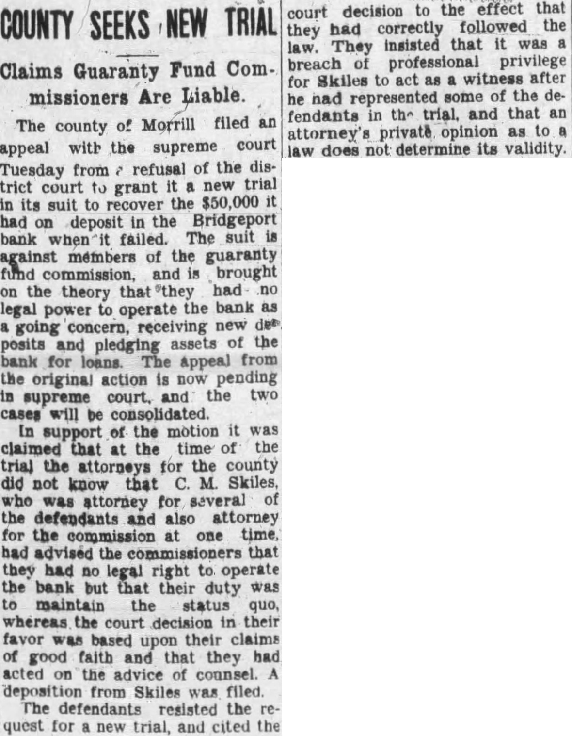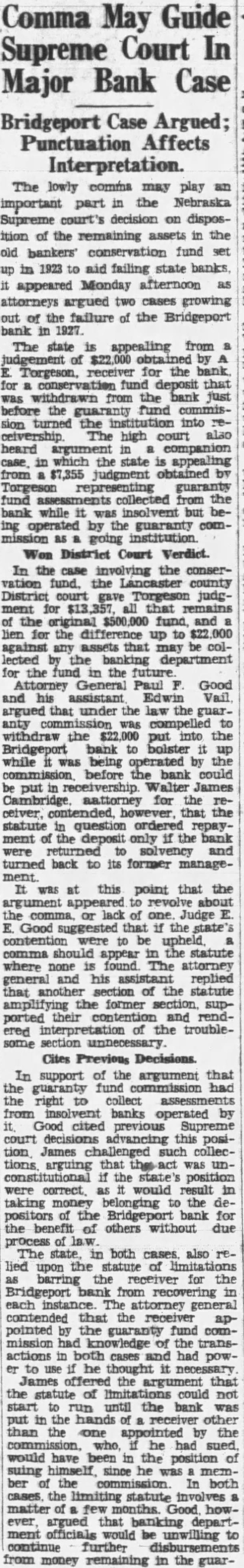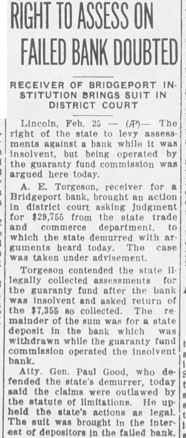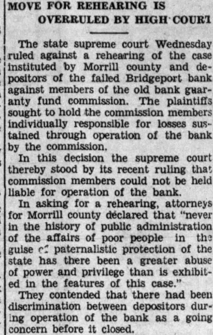Heard before Goss, Rose, Dean, Good, Eberly, Day and DAY, This suit for an accounting brought by Morrill county as depositor of the Bridgeport bank, its behalf and on behalf of all other depositors similarly situated, against the members and agents of the guaranty fund commission of the state Nebraska. The guaranty fund mission took possession of the assets and business of the Bridgeport bank the 15th day of May, 1925, and it concern until the going 8th of September, 1927, during which period deposits solicited and loans made, the accepted, bank's paper was discounted, deposits withdrawn, and all the functions of bank were performed. It leged by the plaintiff that, while the bank was so operated, large amount of deposits were withdrawn, unlawful preference between depositors, the amount of which is unknown to plaintiff and only ascertainable by an accounting. The plaintiff alleges that, during this perof operation by the guaranty fund commission, certain permitted, and which moneys, were fact loans and therefore general claims, were withdrawn, and that the bank was, in fact, unlawfully liquidated while unlawfully operated as going concern. The gist of the action pleaded by plaintiff is in the petition as follows: by reason of the foregoing facts the assets of said bank placed in charge of the defendants who were members, officers and agents of the guaranty commission have become and depleted in in excess of which sum, had said assets been properly and legally administered, would have been available to the discharge of the indebtedness of said bank to this plaintiff and all other depositors and creditors ilarly situated." The trial court found in favor of defendants and entered decree in conformity to its finding, from. which appeals. This is the second appeal filed in this case. The first appeal was taken from decree entered February 1932, and motion for new trial, filed within three days, was overruled May 1932. Defendants filed motion to dismiss this appeal for that no cost bond had been filed and no cash deposit to cover costs or supersedeas bond had been filed as required by section Comp. St. 1929. appearing from the transcript that cost bond had been filed within days from the final order, as providby statute, in conformity to the rule announced by this court in Greb Hansen, Neb. 426, the former appeal was dismissed September 26, 1932, for lack of jurisdiction. On August 29, 1932, during the 1932, term of court, the trial judge in Morrill county, not at the county seat but at Bayard, set aside the order of May 1932, overruling motion for new trial, and the motion was submitted to him and overruled. Later, September 14, 1932, the court at Bridgeport, the county seat of Morrill county, again set aside the order of May 1932, overruling the motion for new trial and, on consideration, the motion was again overruled. on September 1932, the plaintiff's attorneys claim they learned for the first time that the decree of February 1932, had been signed by the trial judge at chambers in Gering, Scotts Bluff county, and was sent to the clerk of the district court at Bridgeport, who entered it on the journal, showing that had been signed by the judge at chambers at Gering, Nebraska. At that time plaintiff filed motion that the decree of February 1932, be held to be void and be set aside on the sole ground that the decree was signed by the trial judge at chambers in Gering, Nebraska, stead of in open court at Bridgeport, Nebraska, and that the motion for new trial with drawn and all orders relative thereto be expunged from the record. October regular day of the May term, the court sustained the motion and reentered the same decree, and overruled plaintiff's motion for trial, filed the same day. This appeal was taken from the decree and order overruling motion for new trial entered October 1932. The appellees, except Bliss, filed motion in this court to dismiss this second appeal for that the transcript was not filed in this court within three months from the rendition of final judgment; that it is an appeal from judgment entered October 1932, which decree is identical with dated February 1932, except the date, from which an appeal was dismissed, and that the reentry of the judgment on October 1932, was for the sole purpose of extending the statutory time perfecting an appeal to this court. This motion to miss the appeal was argued before this court and ruling thereon reserved until the case was submitted upon the merits. demands consideration first. As heretofore noted, the original decree in this was signby the trial judge at chambers at Gering, Scotts Bluff and county, transmitted to the clerk of the trict court for Morrill Did county. this render the decree The judges of the various district courts, have no inherent authority chambers except such they are expressly given by law. The stitution provides: several of the courts of record shall have such jurisdiction at chambers be provided by law. "Const. 23.